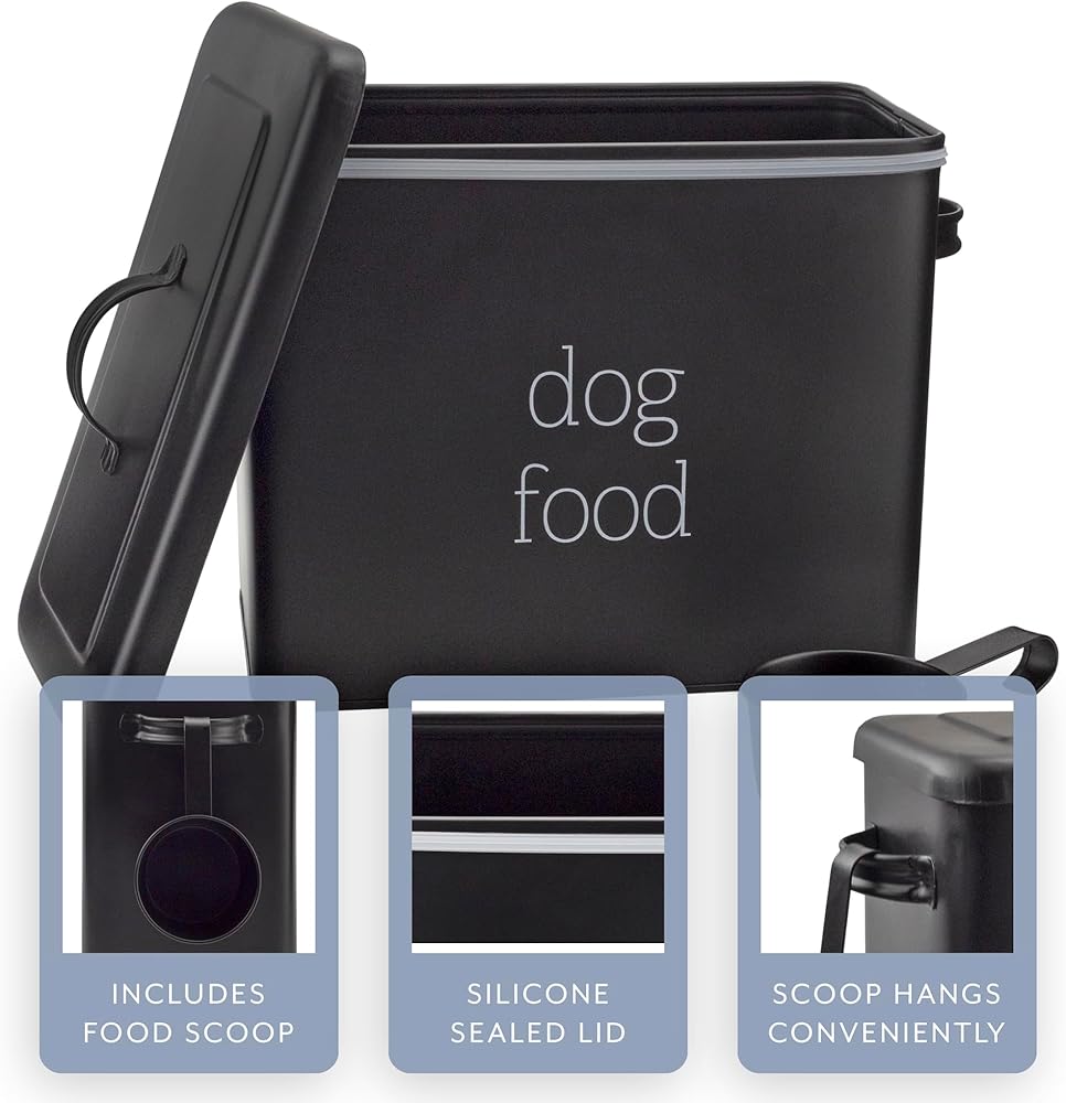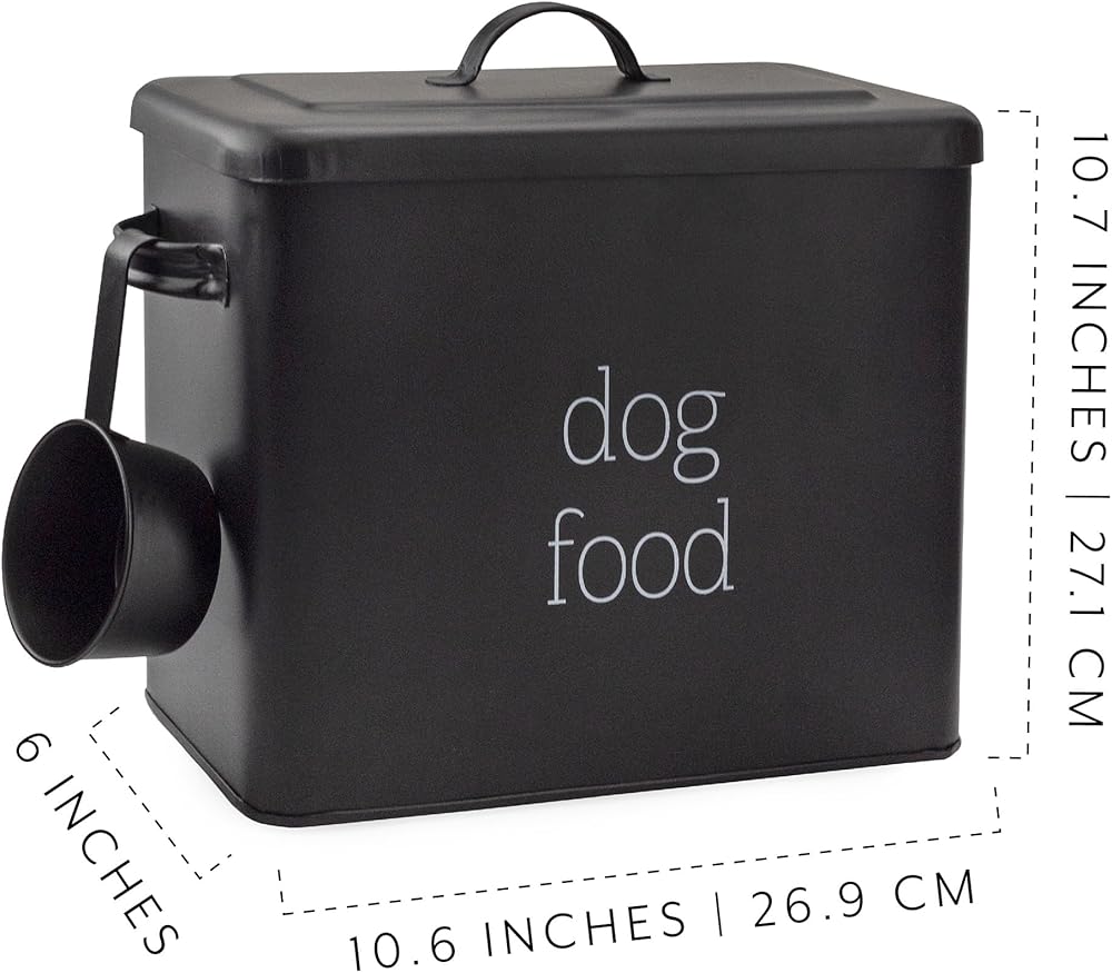 COLOR: Choose black or white with lettering reading “Dog Food”; CAPACITY: 2 gallons (9 quarts = 36 cups)