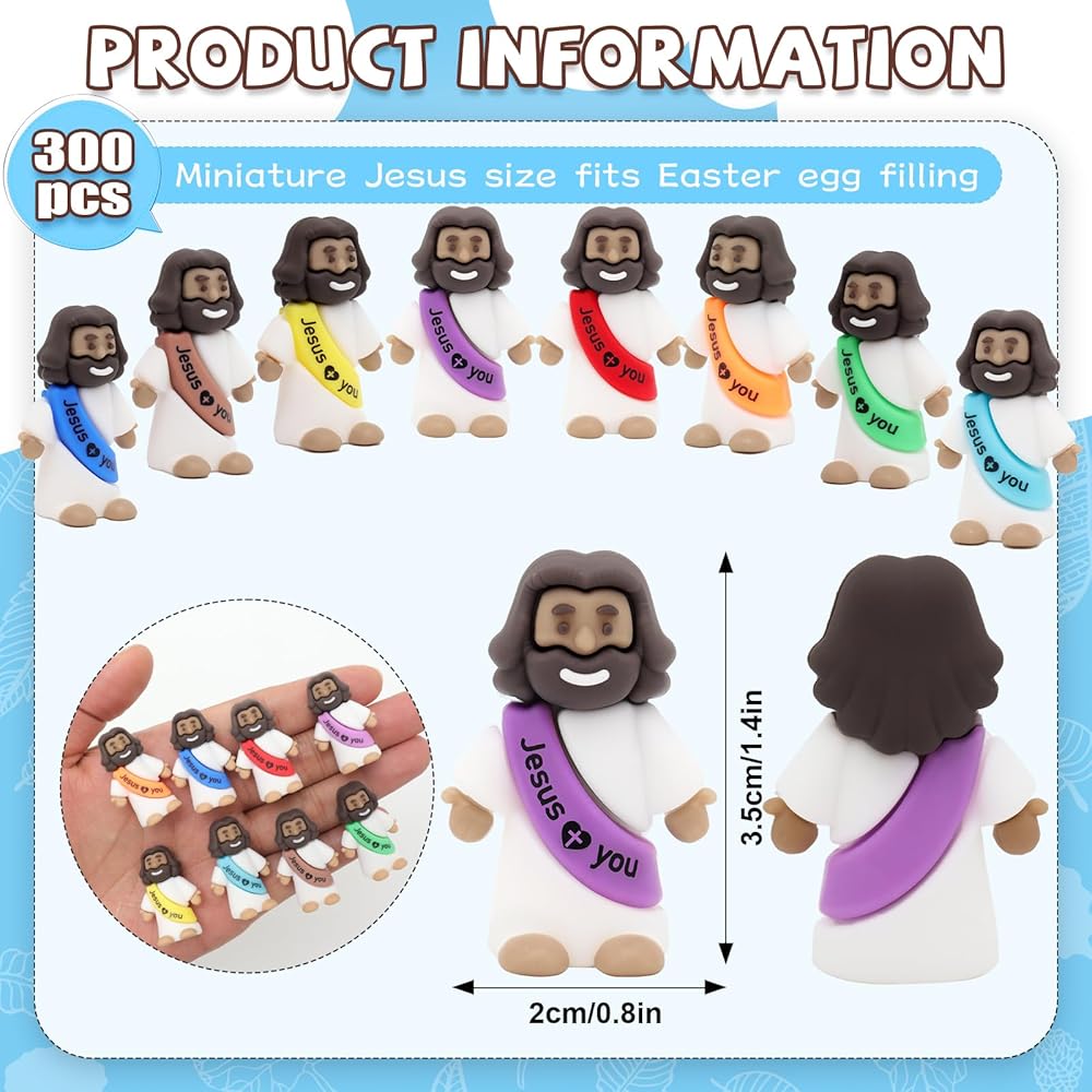 Applicable scenarios: Mini Jesus Figures are used for Easter, religious party presents, church Easter egg hunting, religious activities, and other occasions. Mini appearance, you can place it outdoors and indoors for decoration or play.