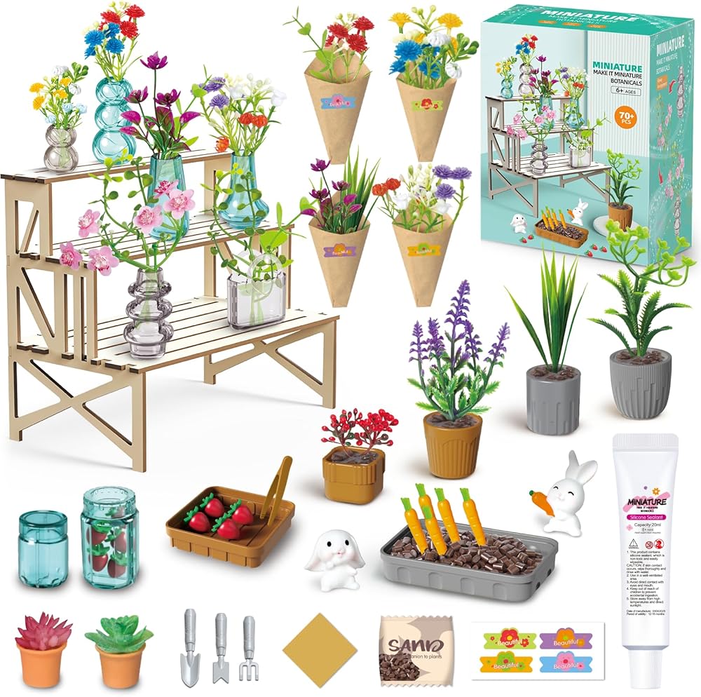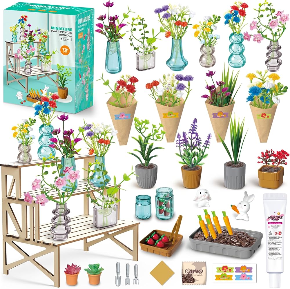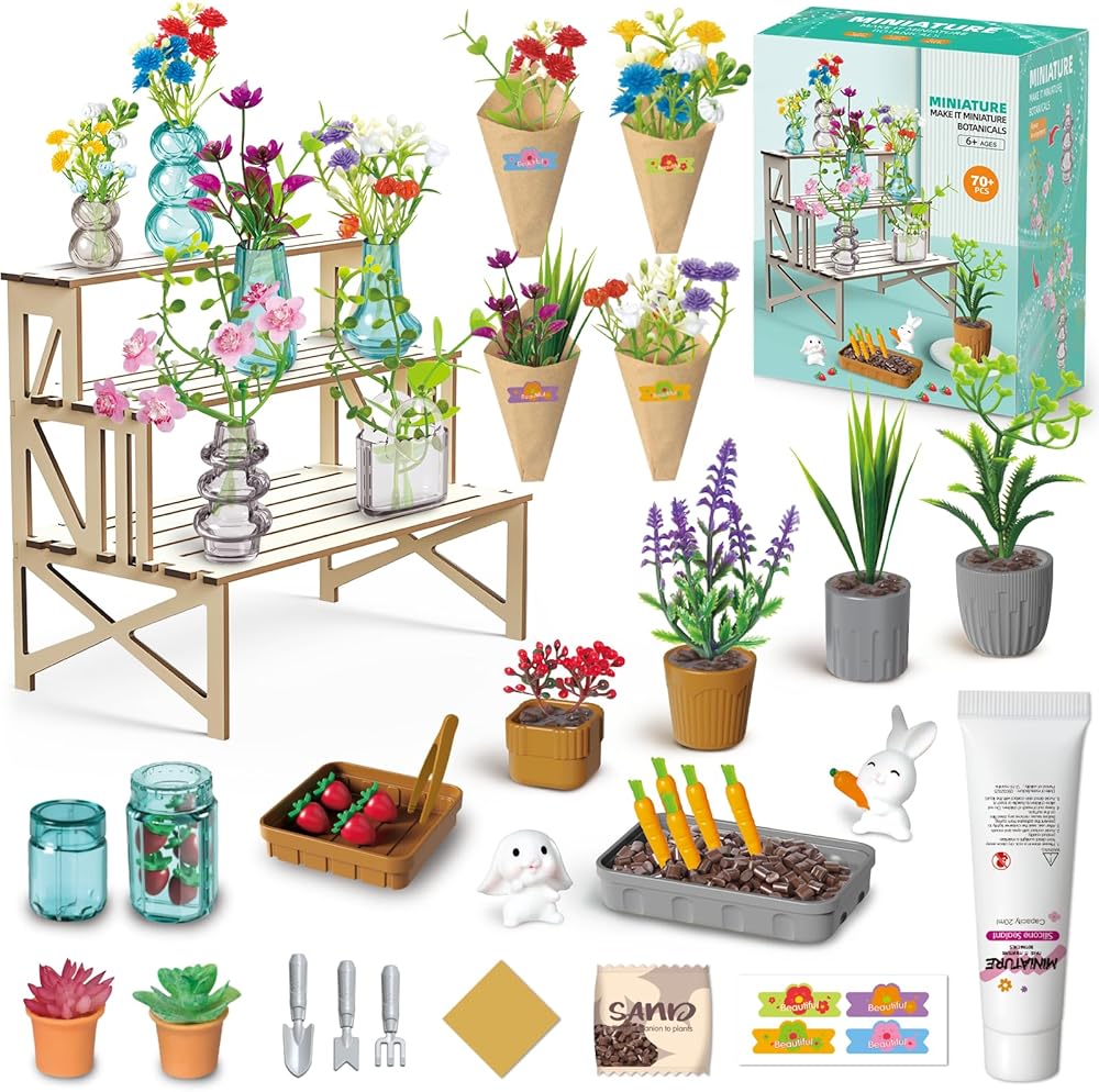 🌿Build Your Own Miniature World: Step into a tiny nature world full of blooming fun! This make it miniature plants playset includes everything you need to craft the cutest mini plants, bonsai, succulent, vegetables, fruits, flowers bouquet, planting tools, containers, and garden or farm displays. With over lifelike 70 pieces from potted plants and strawberries to paper bouquets and wooden display racks—you can create your dream garden, farm, or flower shop right at home!