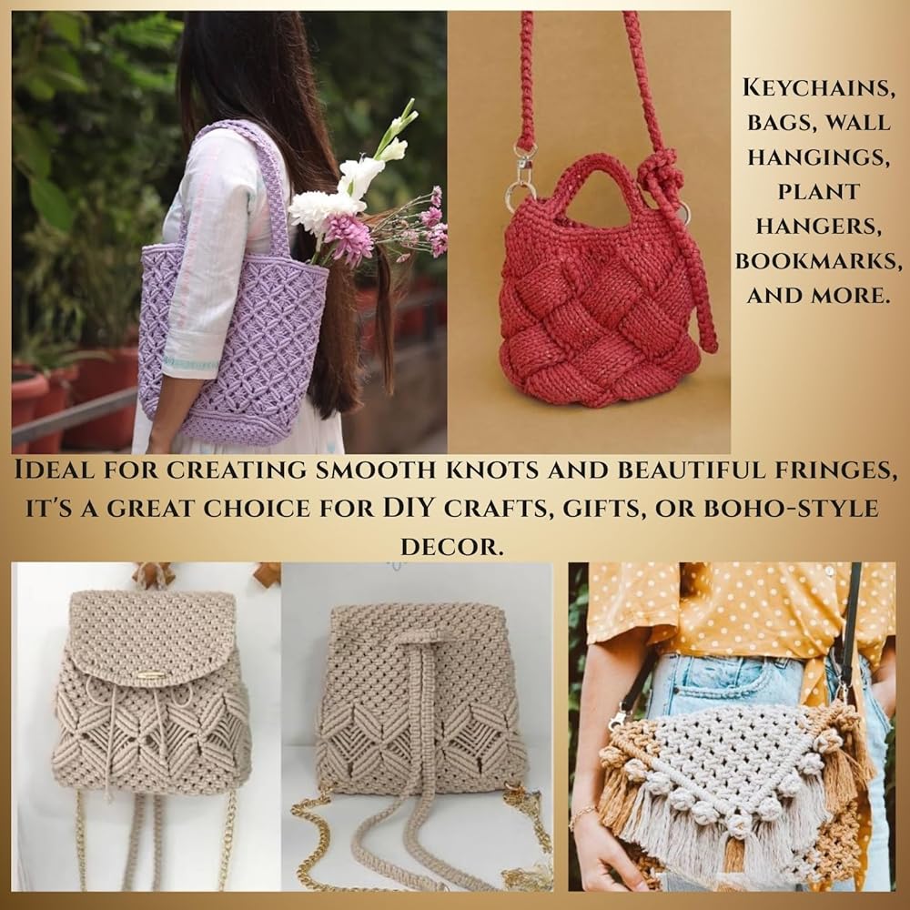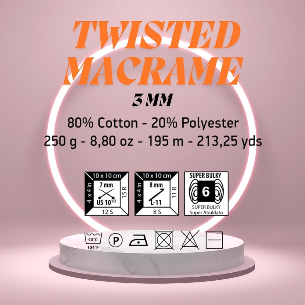 Art of Yarn VR Macrame Cord – 4mm-5mm 195m (213 Yards / 639 Feet), 250g Art of Yarn Macrame Cord – High-Quality Cotton Twine for Macrame, Crafts & More Create stunning macrame projects with Art of Yarn Macrame Cord, a premium-quality twisted cotton rope designed for all your crafting needs. Whether you're an experienced artisan or a beginner, this single-strand 3mm-4mm macrame cord is easy to work with, durable, and perfect for various applications. Premium Quality & Soft Cotton Twine Our macrame rope is made of high-quality natural cotton, ensuring a soft yet sturdy texture for effortless knotting and weaving. Unlike synthetic alternatives, this cotton string is free from harmful chemicals, making it an eco-friendly choice for your DIY projects. Versatile & Multi-Purpose Perfect for a wide range of macrame and craft projects, this rope can be used for: ✔ Macrame Wall Hangings – Create eye-catching decorative pieces for your home. ✔ Plant Hangers – Design elegant, handcrafted macrame plant hangers. ✔ Dream Catchers & Tapestries – Weave beautiful bohemian-style decor. ✔ DIY Crafts & Handmade Jewelry – Use it for knitting, weaving, and crafting. ✔ Gift Wrapping & Packaging – A perfect finishing touch for presents and DIY projects. Strong, Durable & Easy to Use This twisted macrame string is easy to knot, holds its shape well, and is strong enough for large macrame pieces. The soft texture makes it easy on the hands, while the strong structure ensures long-lasting durability. Whether you're making decorative hangings, plant holders, or creative DIY projects, this macrame cord is designed to meet all your crafting needs. Available in Various Colors & Sizes Choose from a variety of vibrant and neutral shades to match your aesthetic. Each skein weighs 250g and measures 639 feet (2213 yards), offering plenty of material for multiple projects. Why Choose Art of Yarn Macrame Cord? ✔ High-quality natural cotton fiber – No synthetic blends. ✔ Soft, durable, and easy to work with – Ideal for all skill levels. ✔ Perfect for macrame, craft projects, and home decor. ✔ Eco-friendly and free from harmful chemicals. Join thousands of crafters who love using Art of Yarn Macrame Cord for their DIY projects. Get yours today and start creating beautiful handmade pieces!