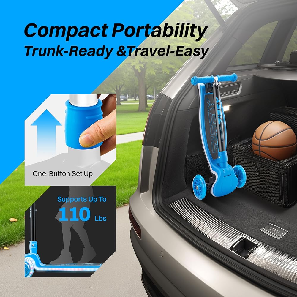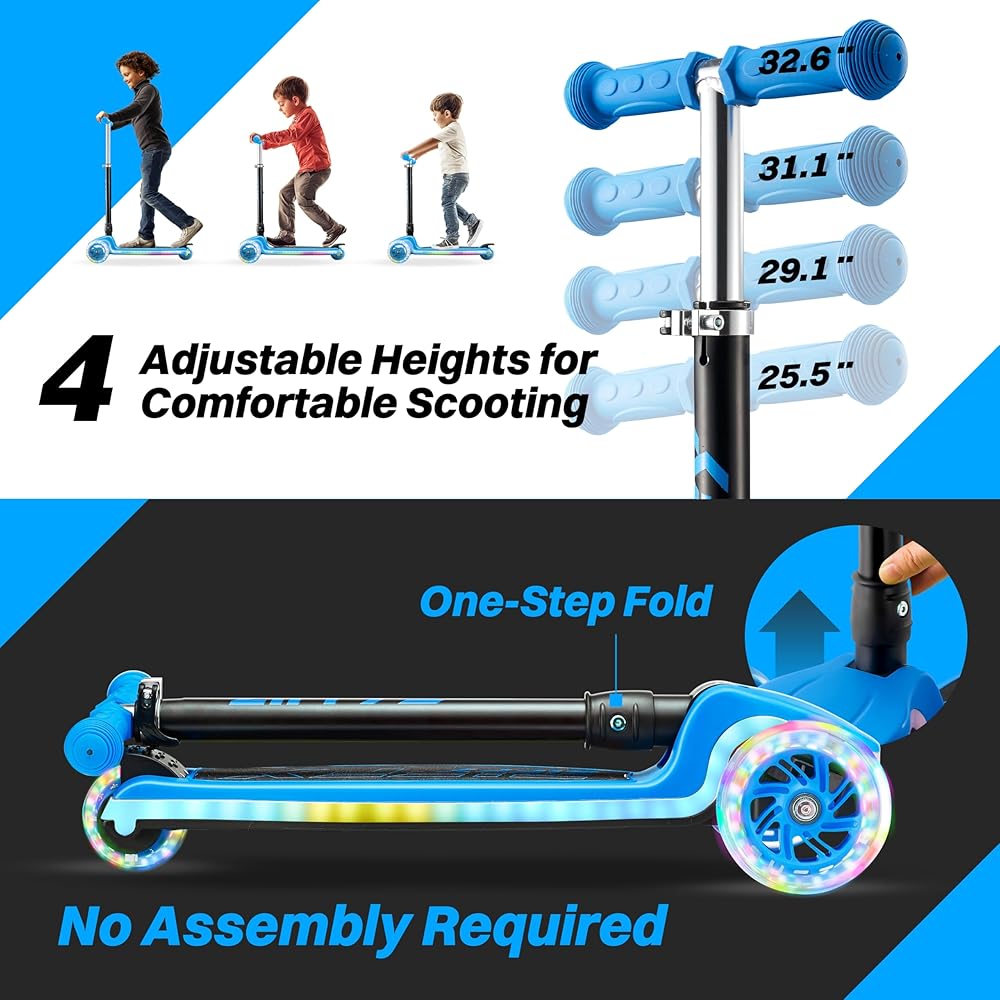 Compact & Portable – No Assembly Required: Thoughtfully designed to grow with your child, this scooter requires no installation and features a 4-level adjustable handlebar (25.5 / 29.1 / 31.1 / 32.6 inches), ensuring a comfortable fit for years to come. The one-step folding system and lightweight design make it easy to carry and store—perfect for trips to the park, school, or family vacations.
