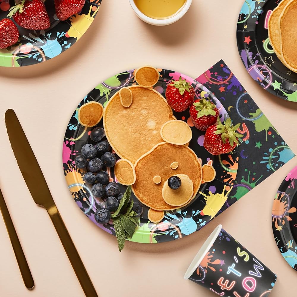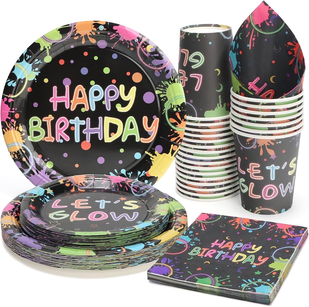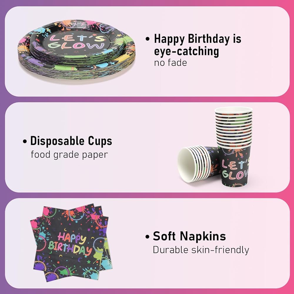 96 Pcs Birthday Plates and Cups and Napkins Party Supplies, Black Neon Theme Happy Birthday Party Paper Plates and Napkins Sets for Kids, Serve for 24 Guests, Serve for 24, Black Let's Glow