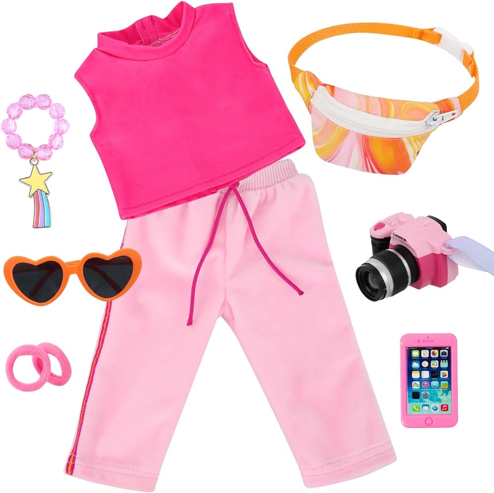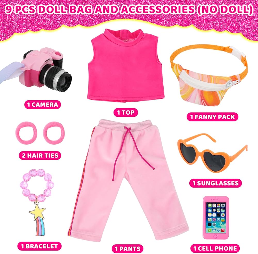 American 18 inch Doll Clothes and Accessories Travel Bag Set Including Pink Top Pants Sunglasses Camera Toy Cell Phone Hair Ties and Bracelet Fit for 18 inch Doll