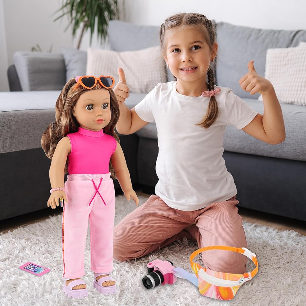 Premium Safety:18 inch doll travel set is made of eco-friendly, safe and non-toxic material, waist pack and other accessories such as glasses perfect fit 18 inch girl doll and the other 18 inch girl dolls.