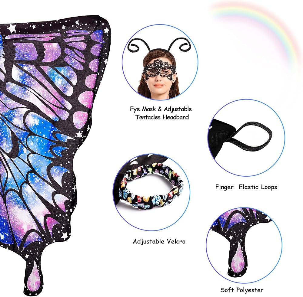 • 🎉 Easy to Wear: Your fingers through the loops of the butterfly cape adult and freely adjust the tightness of the mask, neckband, and antenna headband.