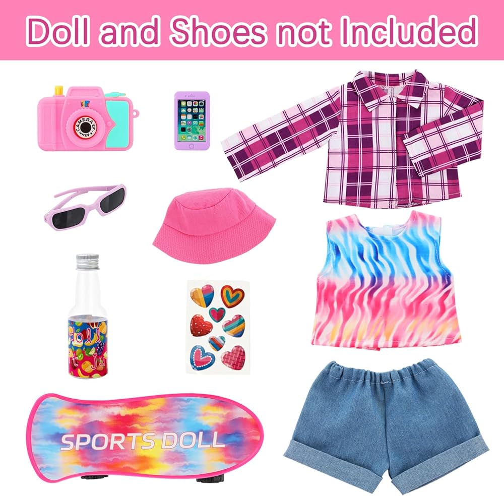 Package Includes : Outdoor Fashion girls theme accessories include 1 Fisherman's Hat, 1 Mobile Phone, 1 Camera, 1 Pair of Glasses, 1 Long-Sleeve Plaid Shirt, 1 Tie-Dye T-Shirt, 1 Pair of Denim Shorts, 1 Soda Bottle, 1 Heart-Shaped Sticker, 1 Skateboard - Total of 10pcs(Doll & Shoes Not Included)