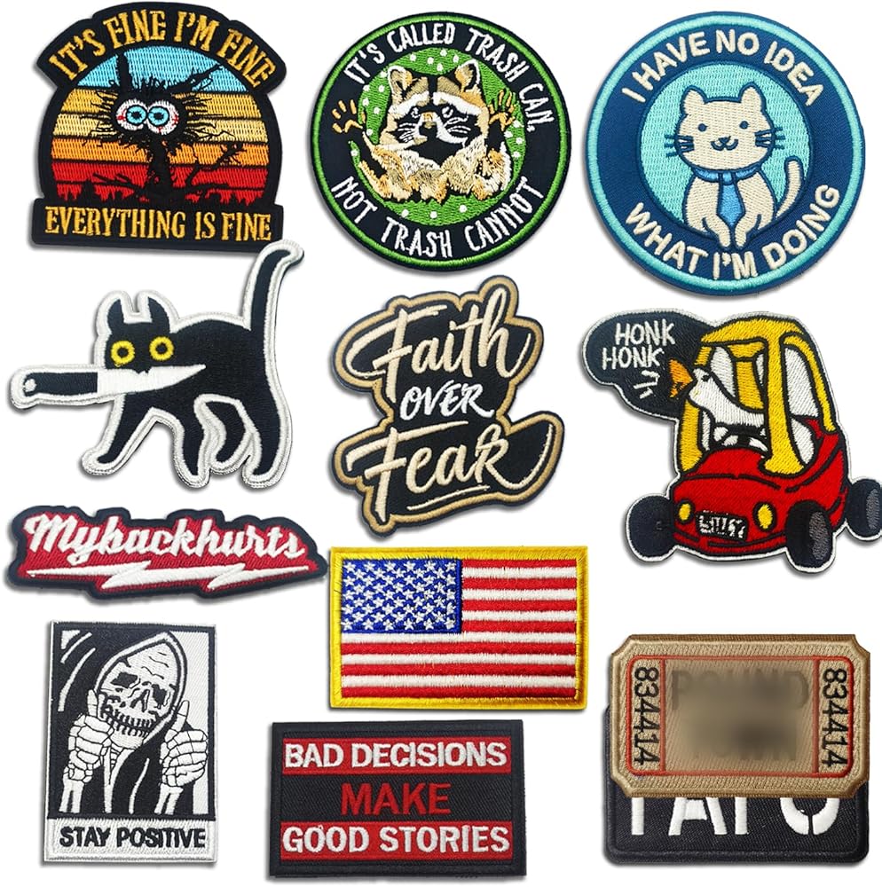 Diverse Fun Designs This 11-piece patch set features hilarious slogans (e.g., "It's Called Trash Can") and quirky animal illustrations, offering versatile styles to personalize jackets, backpacks, or pet harnesses. Each 3-inch patch adds humor and personality for teens, adults, and tactical enthusiasts.