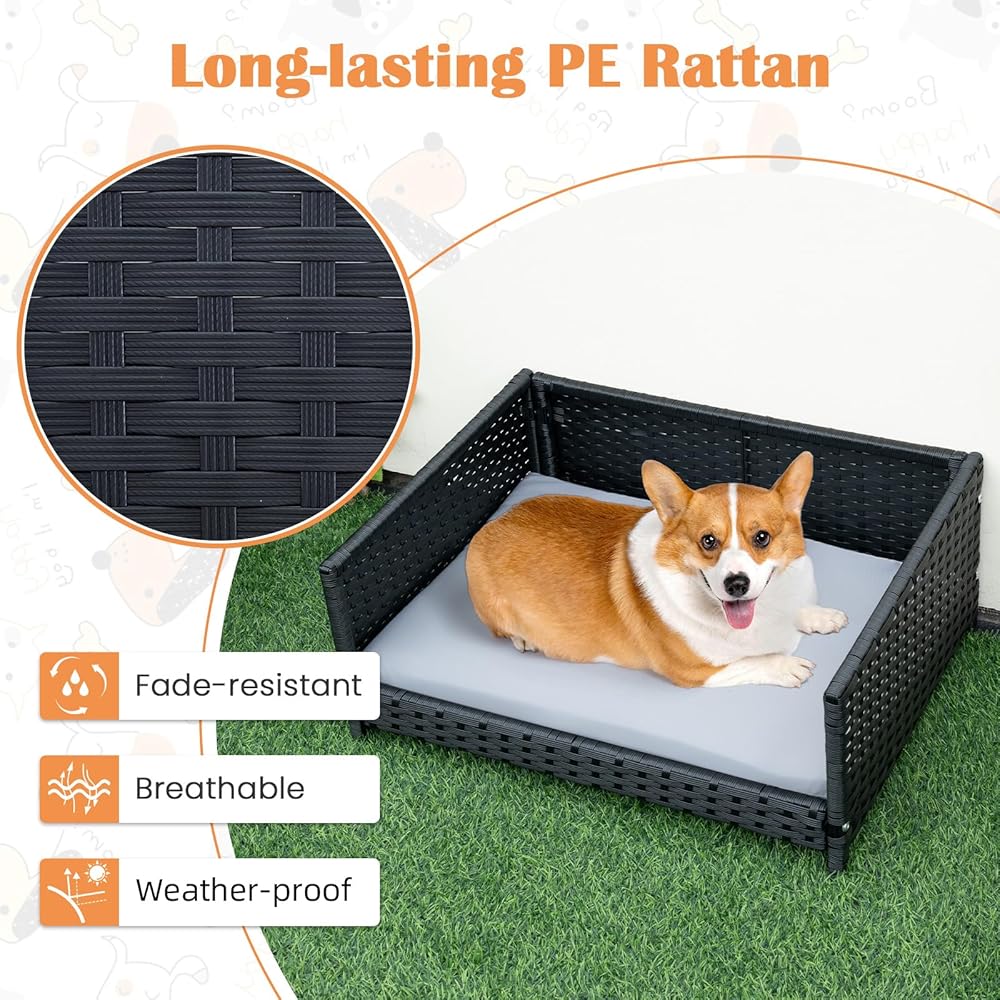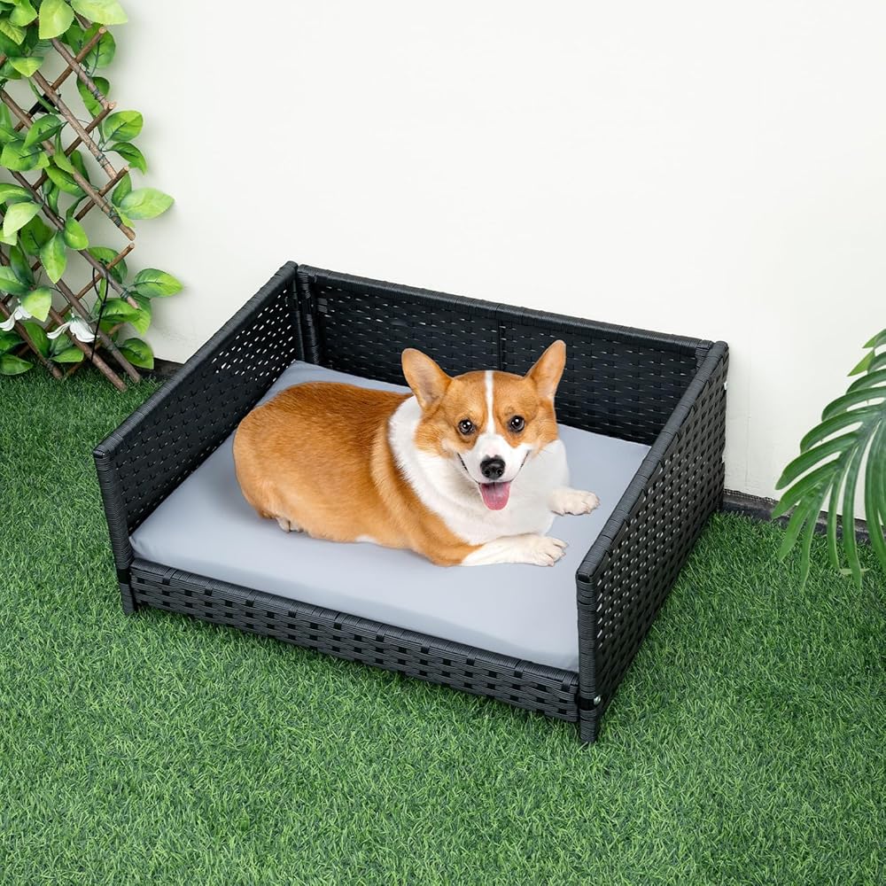 [Breathable Material & Considerate Design]: Crafted from premium PE rattan, this wicker dog bed resists fading, sun and rain damage, and wear for long-lasting use. The breathable material ensures your pups stay comfortable, while the elevated legs enhance air circulation, keeping your furry friends cool and happy.