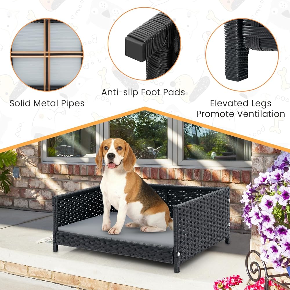 PETSITE Wicker Dog Bed, Rattan Pet Bed with Metal Frame, Soft Waterproof Removable Cushion, Elevated Indoor Outdoor Dog Couch Sofa for Small Medium Sized Dogs, 24.5 x 18 x 10 inch