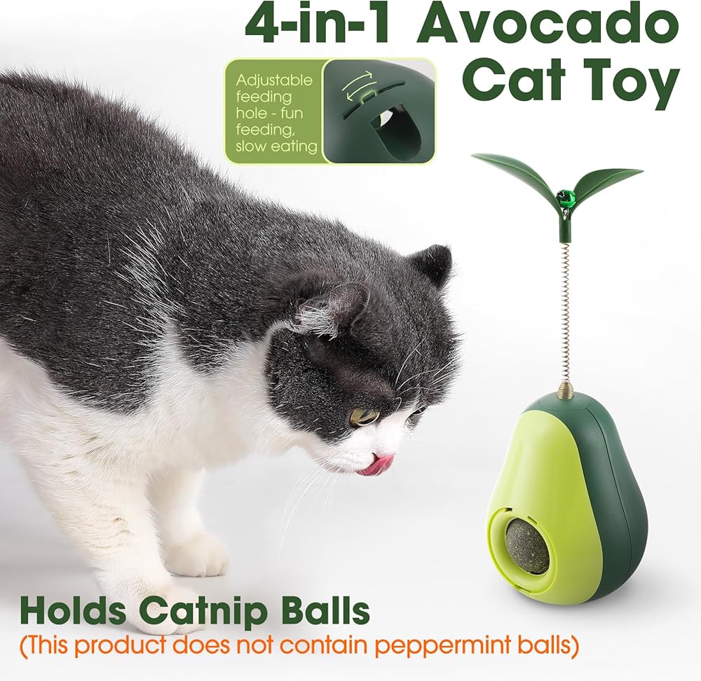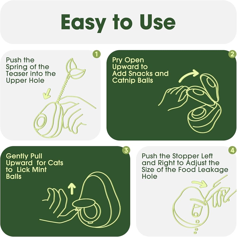 4 ways to play: Put your cat's favorite snacks in it and use it as a food leaking toy. Install catnip balls for your cat to lick (This product does not contain peppermint balls). The tumbler design can swing left and right. The mini cat teaser design, the spring and leaves swing, making a crisp bell sound. 4 ways to play stimulate your pet's playful nature and enhance their entertainment.