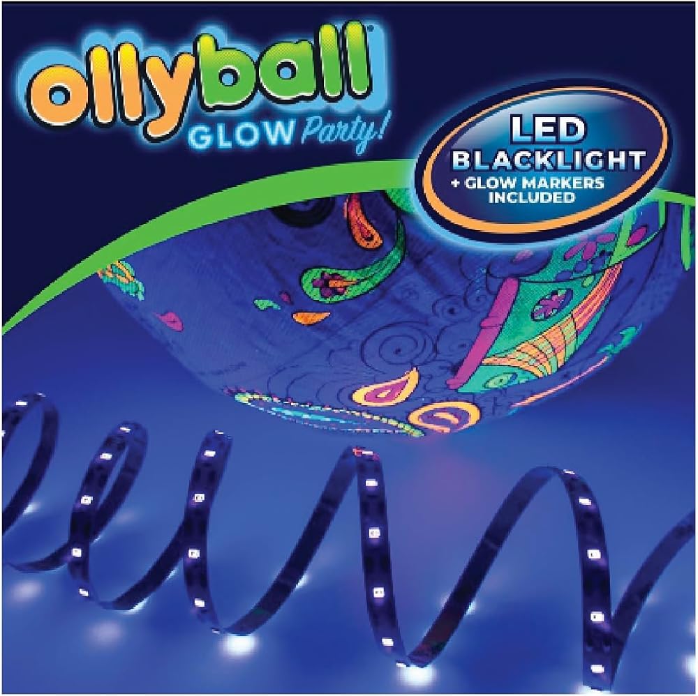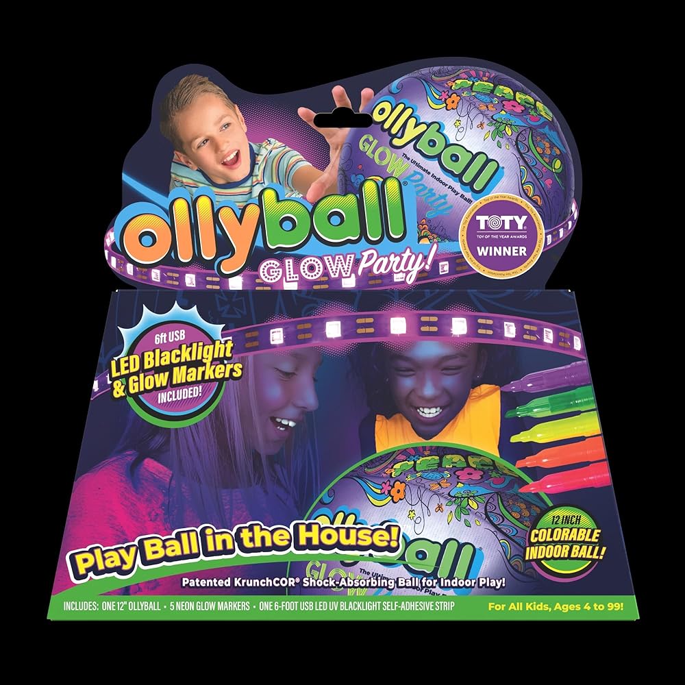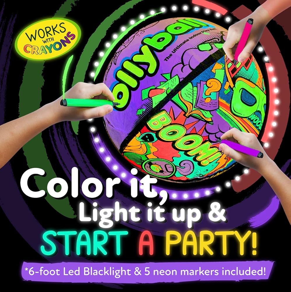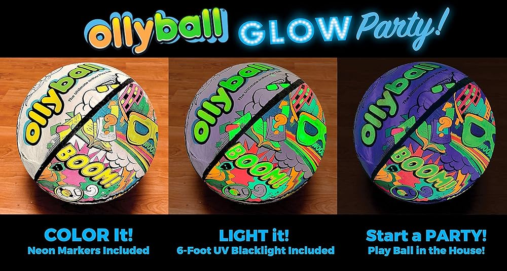 💥WHAT IS THE SECRET? The Ollyball's Patented KrunchCOR was designed for full-speed, full-force indoor play. Our Glow Party Ball comes with a 6-foot LED UV Blacklight strip and 5 GLOW Markers.