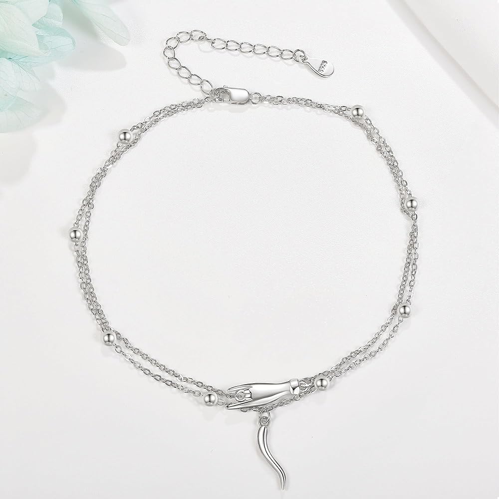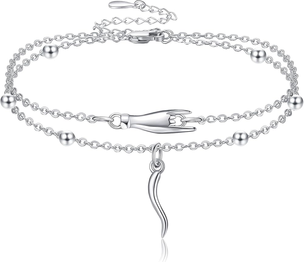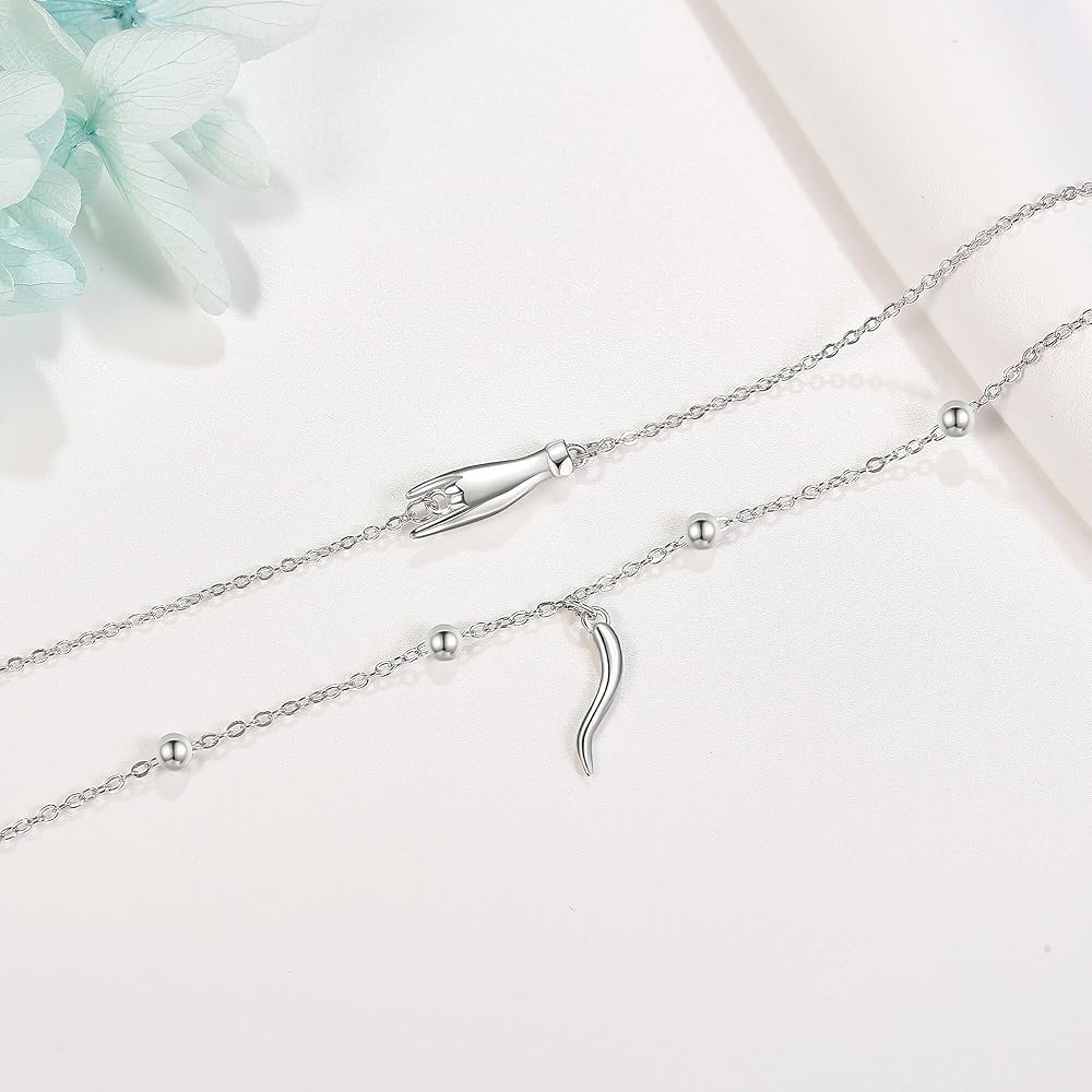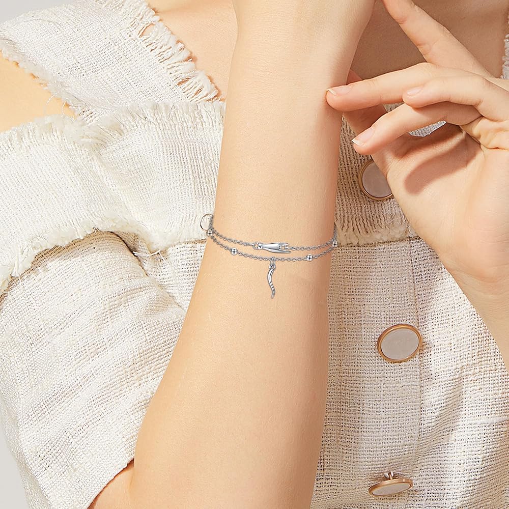 YAFEINI Italian Horn Hand Bracelet 925 Sterling Silver Cornicello and Mano Cornuto Layered Bracelet Italian Good Luck Protection Amulet Jewelry for Women Girls
