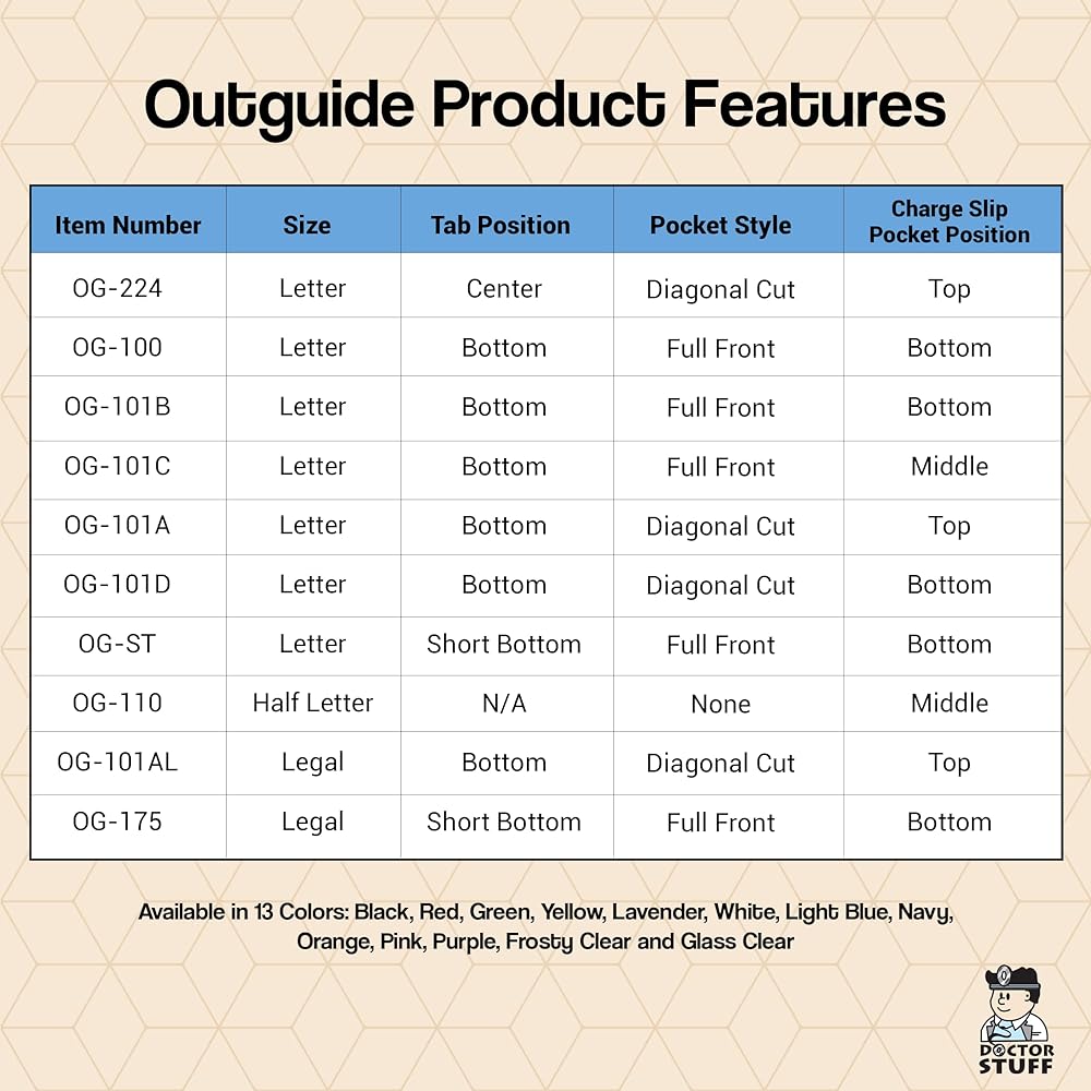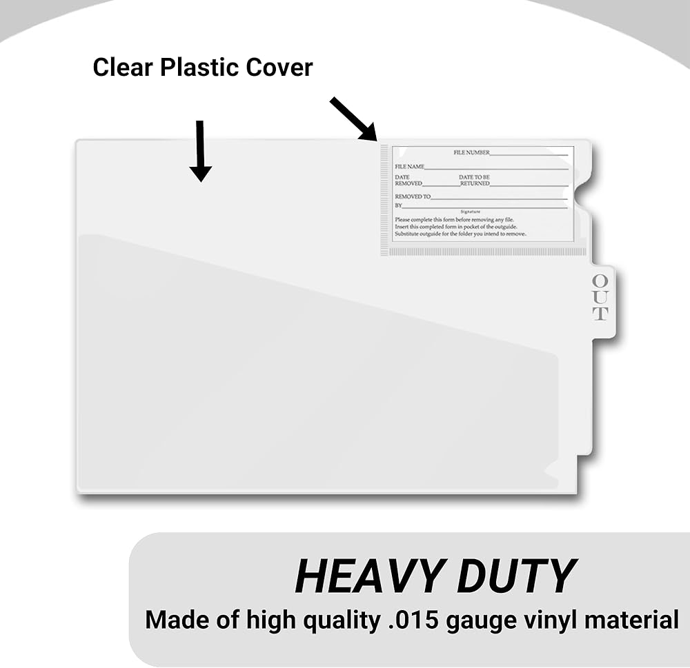 Doctor Stuff premium quality, vinyl outguides are the perfect solution to easily locate a file that has been removed from your filing system by simply placing the outguide in location of the file folder you need until the file folder is returned. Full pocket or diagonal cut pockets allow you to store important patient information, and all contain a charge out slip pocket (charge out slips not included). These vinyl outguides are made of strong .015 gauge vinyl, so they are long-lasting and resuable. Perfect for physicians, dentists, veterinarians, accountants, insurance and billing offices, nursing/convalescent homes, surgical centers, hospitals, health care centers, clinics, etc., to maintain an organized file folder system.