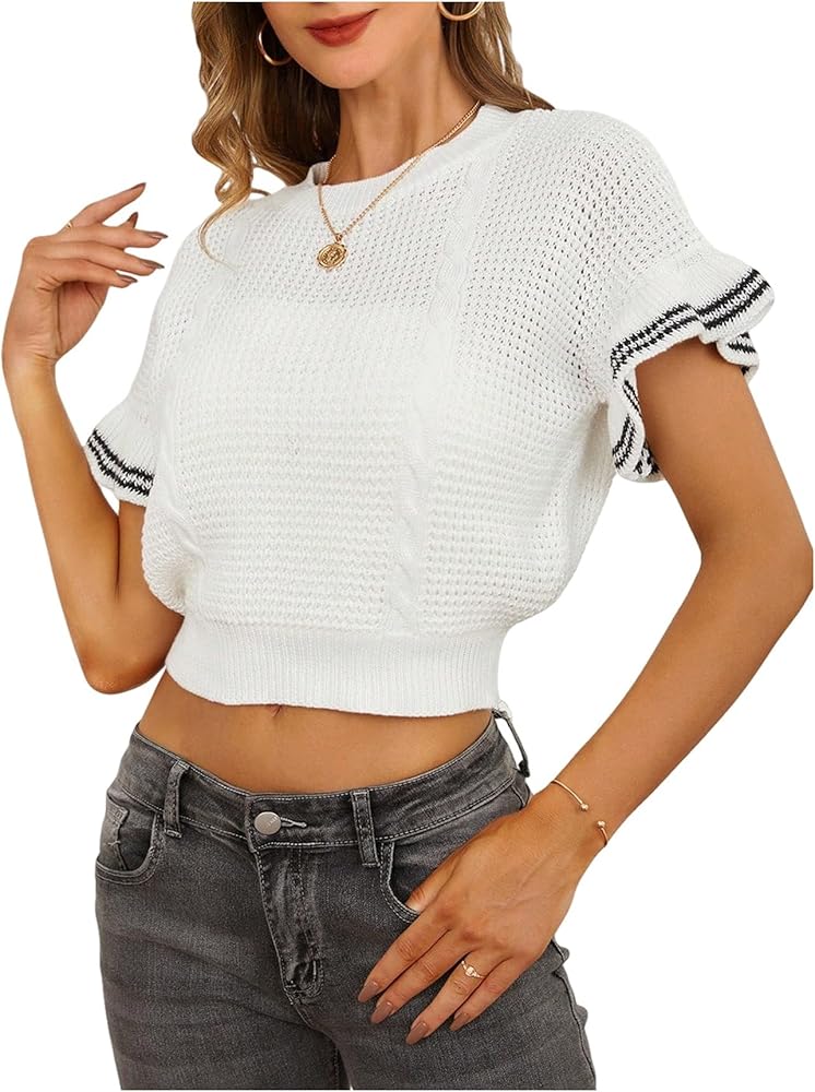 Verdusa Women's Ruffled Short Sleeve Round Neck Knitted Top Pullovers Sweater