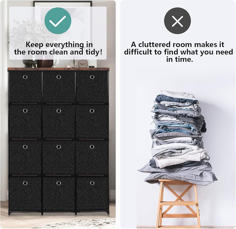 【Large Storage Space】Our tall dresser features 12 foldable fabric drawers, providing enough capacity for sorting home essentials such as clothes, lingeries, blankets, toys, electronics, kitchenware, office suppliers. Each drawer can hold up to 10 lbs. The top is handy to place picture, mirror, clock, magazines and other frequently used items. But we do not recommend to put items over 25 lbs.