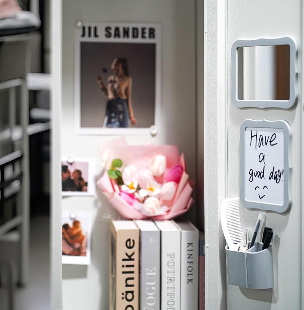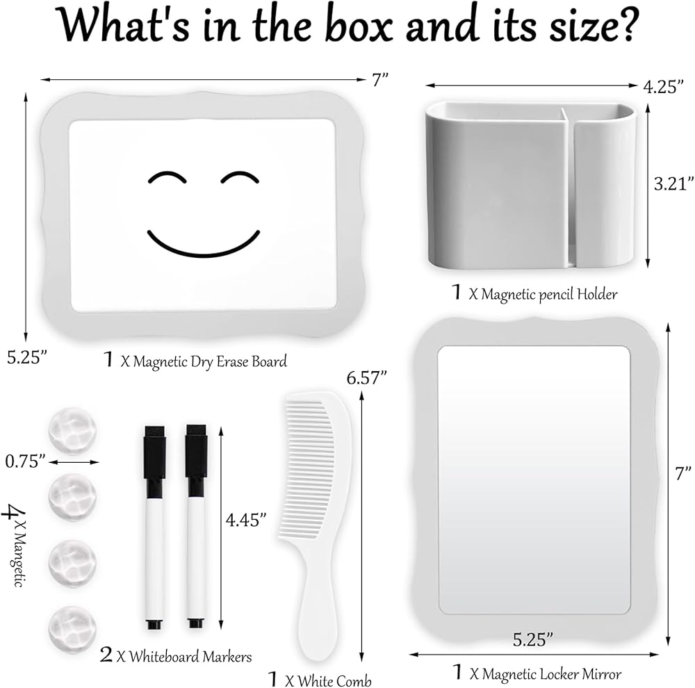 Start The School Year With New Minimalist Chic Style: Elevate your dressing room style and simplify your daily routine with our locker accessories, including 1 pcs pink magnetic locker mirror, 1 pcs magnetic pencil holder, 1 pcs magnetic dry erase board, 2Pcs whiteboard pens, 4 pcs Fridge Magnets and 1 Pcs Comb. Elevate your dressing room style and simplify your daily life!