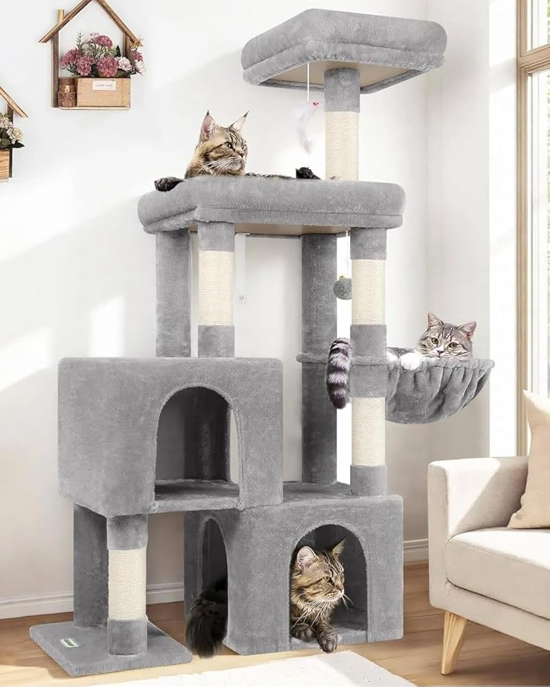 Design for Multi-Cat Households: This 52-inch multi-level cat climbing tower is designed for multi-cat households and perfectly combines scratching, climbing, resting, exercise and entertainment functions. Its height not only allows cats to get up and down freely, but also makes it convenient for pet owners to interact with cats