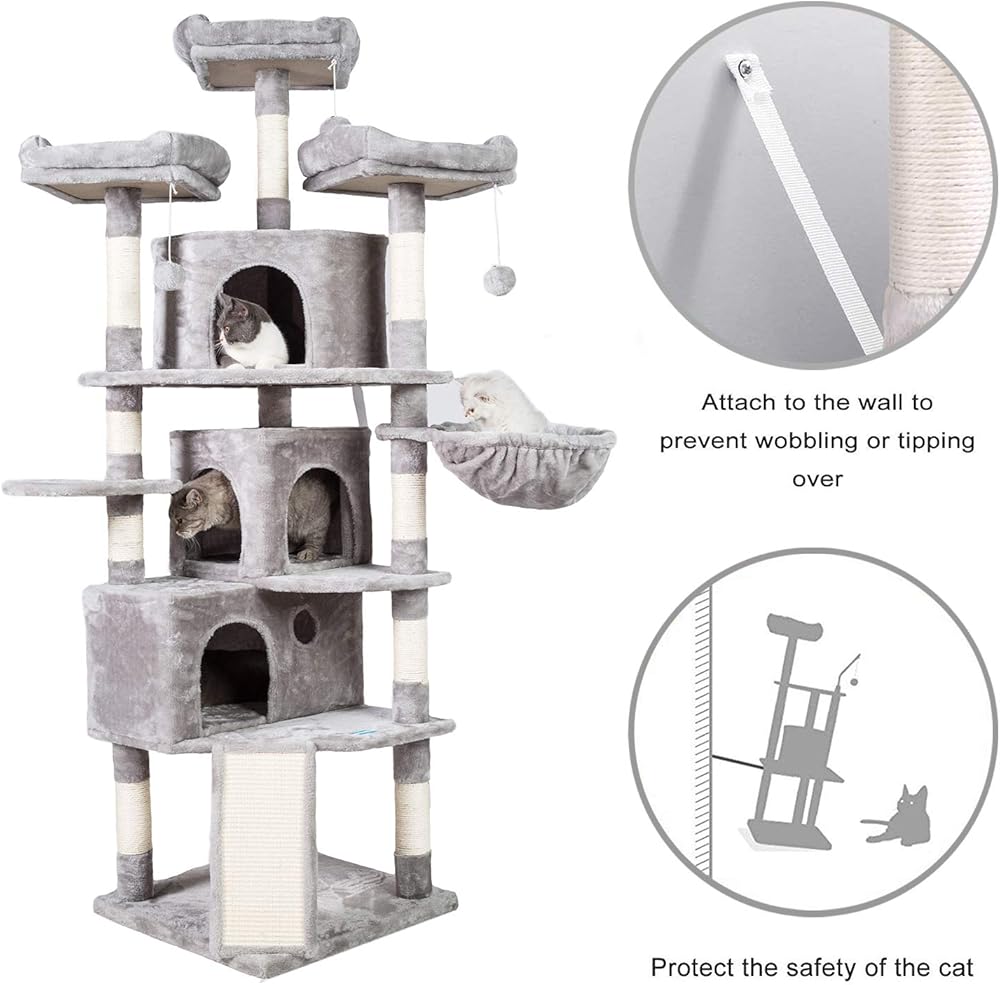 COMFY HOME FOR ENTERTAINING: 3 roomy condos offer luxurious napping experience; 3 plush perches with raised edge allow more safety for cats to enjoy the feeling of the top of the world while resting; 3 interactive jingly balls to play with, several layers layout for climbing up and down, sisal-covered slope adds so much more fun for playtime.