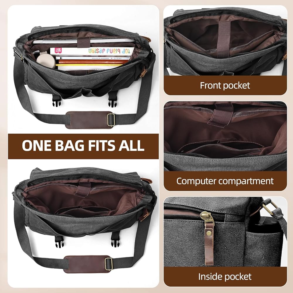 Spacious Multi-functional Storage - This messenger bag features a flap-over design with 2 sturdy plastic snap buckles to secure your valuables. The main compartment easily fits a 15.6-inch laptop, while the interior includes a dedicated laptop sleeve, multiple organizer pockets, and ample space for tablets, books, stationery, chargers, and other essentials