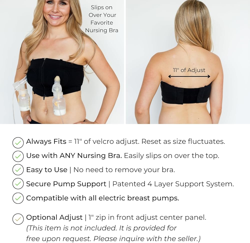 FULLY ADJUSTABLE PUMPING BRA: Comes with a convenient 11" adjustable Velcro back panel to ensure a perfect fit as your body goes through natural postpartum changes during pumping and nursing.