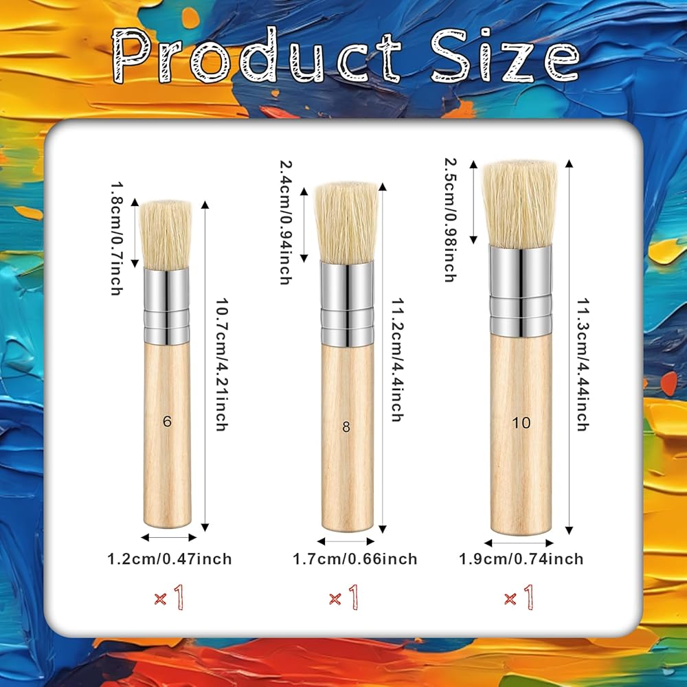 Versatile Sizes for Every Project: Choose from 3 different sizes of wooden stencil brushes to meet your creative needs: Small (10.7x1.2cm, bristle length 1.8cm), Medium (11.2x1.7cm, bristle length 2.4cm), and Large (11.3x1.9cm, bristle length 2.5cm). Perfect for detailed stenciling or large coverage on various surfaces.