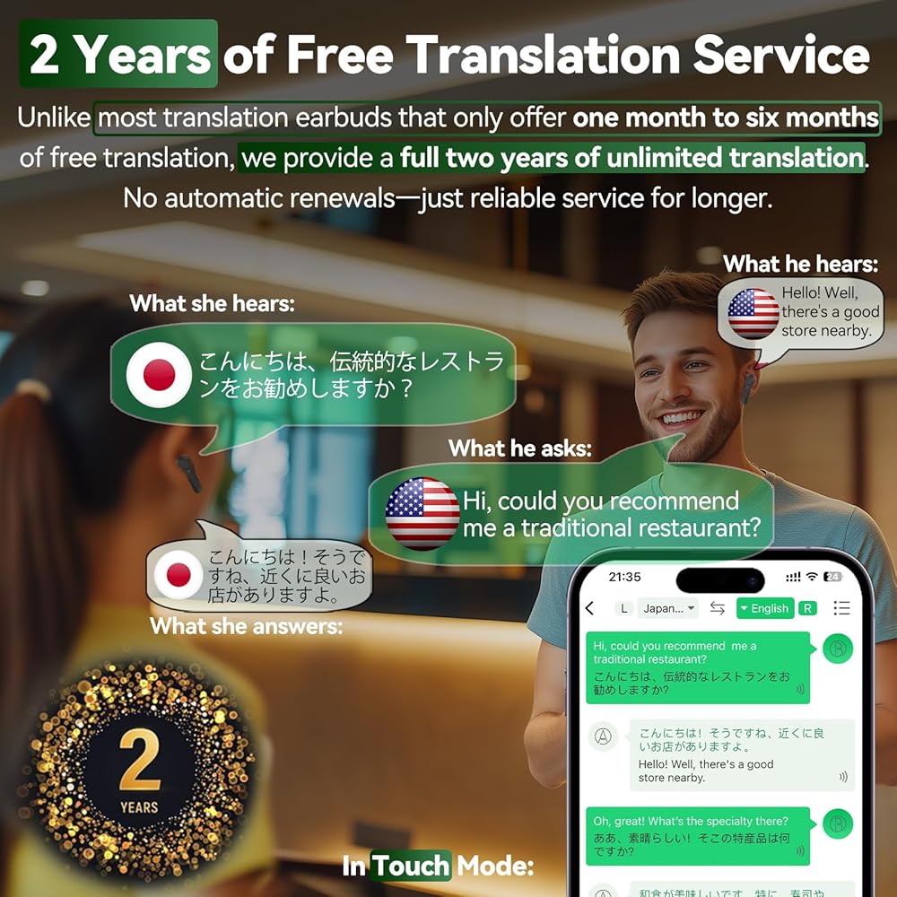 Unlock global communication with KILOGOGRAPH's translating earbuds real time B11, the ultimate real time translation device for travelers, business professionals, and language learners alike. With support for 138 languages and accents, these earbud translator in real time boast an industry-leading 98% translation accuracy. Whether you're navigating new cities or attending international meetings, B11 helps you communicate clearly and confidently across nearly any language barrier. The two-way, real-time voice translation feature allows for seamless conversations—just select two languages, and B11 will instantly translate what you and your conversation partner say. It's like having a personal traductor de ingles español in your ear! Our free translation service lasts an unparalleled two years—unlike other translation earbuds that offer only a few months to a year. Plus, there's no risk of automatic renewal, giving you full control of future subscriptions. You can switch between 3 highly practical modes for various situations: Touch Mode for familiar conversations, Speaker Mode for translating via your phone's speaker without needing to share your audifonos traductores inglés español, and Free-Talk Mode, which automatically detects pauses in your speech to translate without you needing to click or tap—perfect for natural dialogue in group settings or business meetings. Beyond its powerful translation capabilities, the B11 is also a premium music TWS earbud. With crystal-clear sound quality and up to 15 hours of playback time (with the charging case), it's perfect for enjoying music, podcasts, or calls. Designed for all-day wear, these lightweight portable voice translator offer both comfort and convenience, keeping you connected whether you're on a long flight or navigating a bustling city. audífonos traductores de idiomas