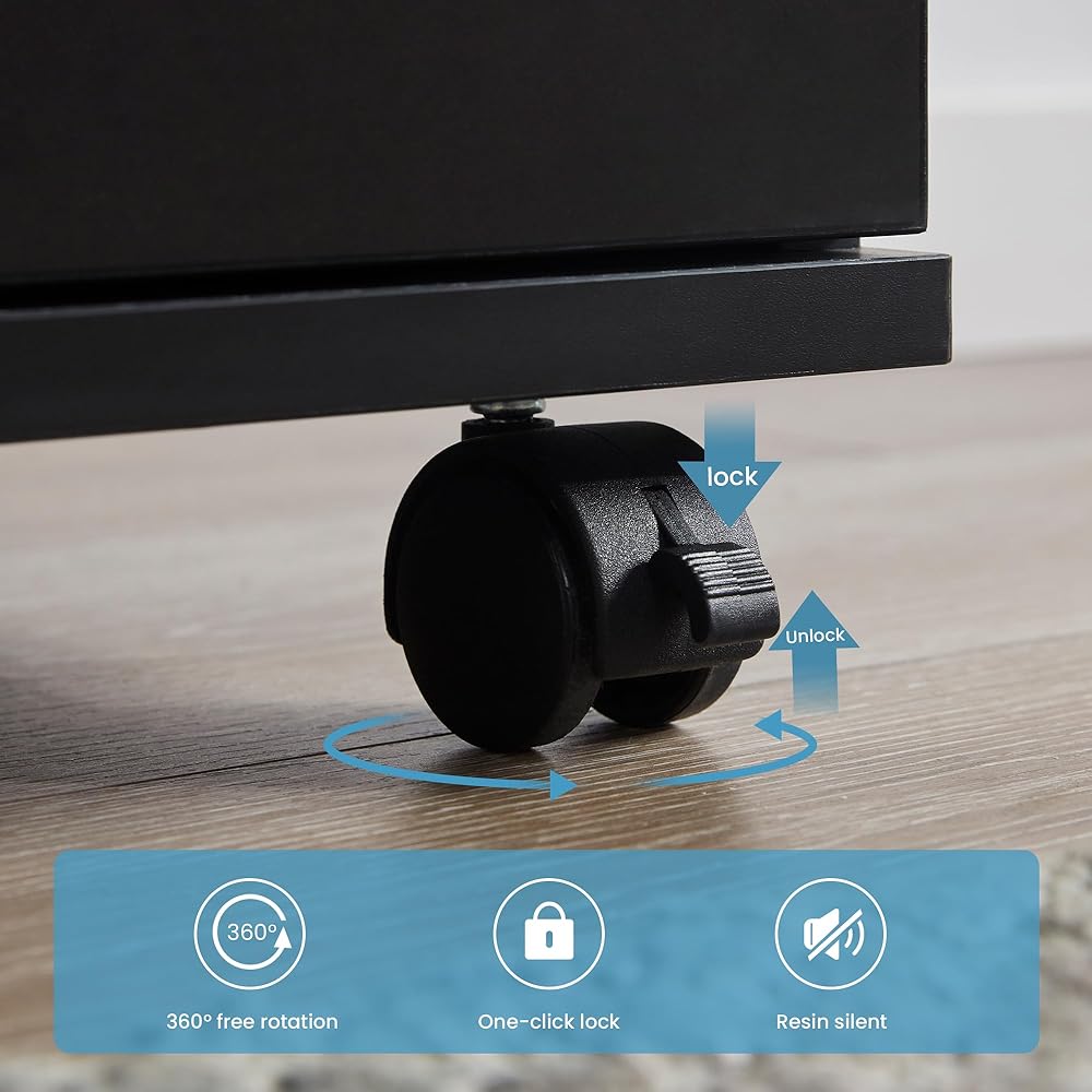 Smooth-Rolling Casters for Mobility – Equipped with four durable casters (two lockable) for easy movement and stability, allowing you to reposition the cabinet effortlessly as needed.