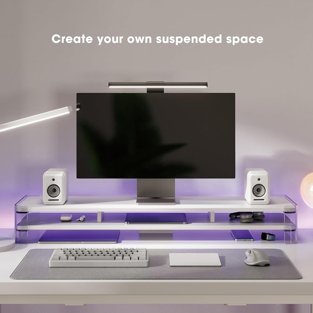 【Double Storage】: Acrylic monitor stand is 2 tier storage organizer for laptop, computer or tv stand. The first level with three compartments; The bottom layer is a super large space of 38.7 inches, can be used to store keyboards, mice or other office supplies, adding more storage space and making your desktop tidier.