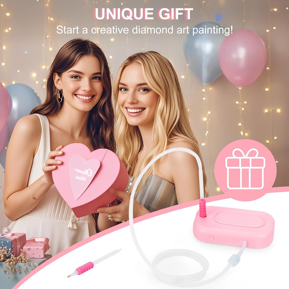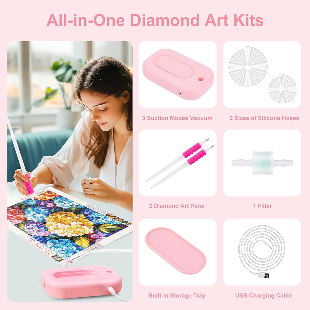 Complete All-In-One Diamond Art Kit - Comes with 1 x micro vacuum pump connected to 1 x upgraded diamond painting pen with USB power cable, 1 x storage tray, 1 x user manual. No assembly required, PLUG AND PLAY. The compact USB-powered design fits in bags/backpacks for easy carrying