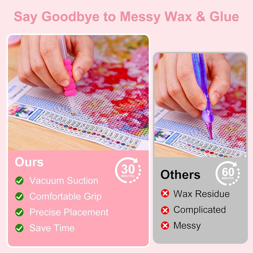 No Wax Residue, Shiny Finish - Say goodbye to messy glue stains! The vacuum suction system ensures precise diamond placement without adhesive, preserving the artwork's clarity and elegance, delivering a clean and professional finish every time