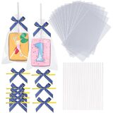 ROSPAKTEK 50pcs 4x6Inches Clear Rice Krispie Treat Bags with Sticks and Ties Bows Rice Kit Cakesicle Bags Individually Wrapped Packaging for Marshmallow Mcaron Pop Candy Apple Cookies Cake Ore Pop