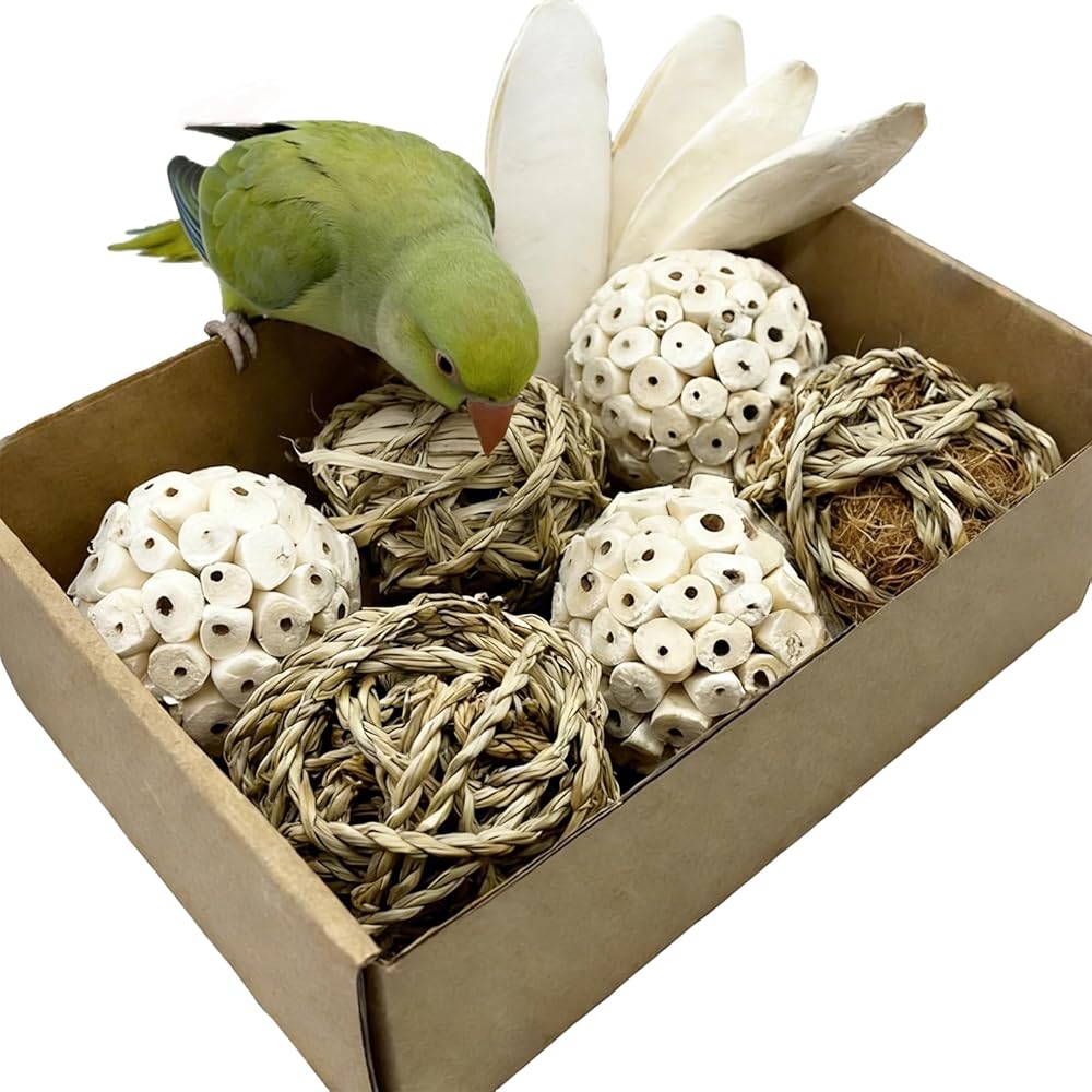 【Abundant Styles 】We provide 5 different chewing bird toys for your pets: sola balls, coconut palm ball, corn leaf ball, seaweed ball, cuttlebone. Variety is the biggest highlight of our toys!