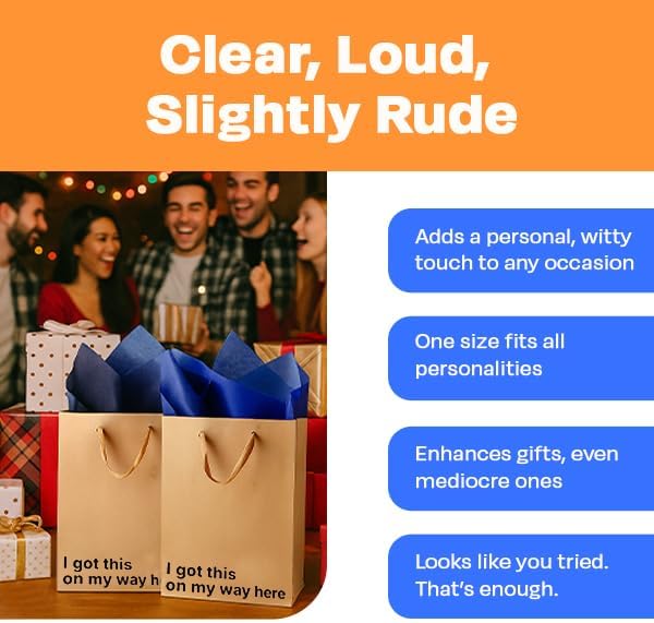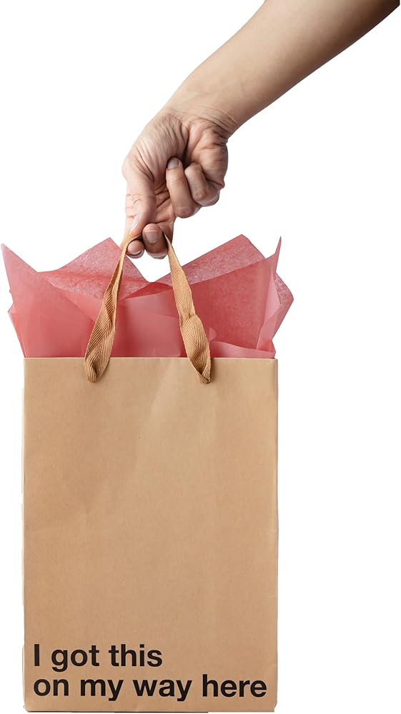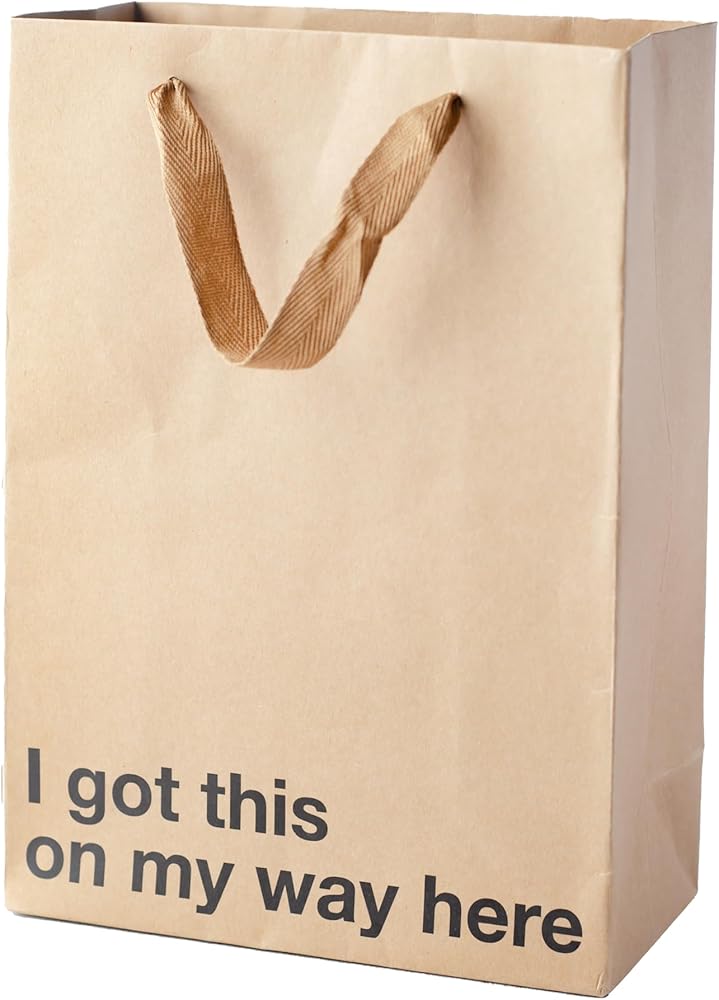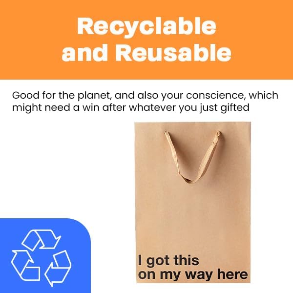 Ever grabbed a gift on the way to an event? This bag has you covered. Our single 7 x 12-inch brown kraft gift bag printed with funny text turns an ordinary present into a hilarious surprise. This funny gift bag not only wraps your gift in style but also gets everyone laughing from the moment you walk in – the ultimate gag gift wrap for anyone who loves to keep gifting fun and light-hearted. Made of high-quality brown kraft paper, this sturdy paper party bag is built to carry your goodies securely. At 7 x 12 inches, our 7x12 kraft bag can accommodate a variety of items – from a book or box of chocolates to a wine bottle – with ease. Strong handles and reinforced seams ensure your surprise stays safe, making it a reliable gift wrap for birthdays, office exchanges, and more. Plus, the durable construction means the bag can be reused, spreading joy (and laughs) time and again. Whether you need a funny holiday gift bag for a Christmas party or a quirky wrap for a birthday present, this versatile bag brings a playful twist to any occasion. The bold message on the front is a guaranteed conversation starter that makes your gift memorable even before it's opened. From Father's Day and Mother's Day to office celebrations, it ensures your gift stands out with humor and quality. Add a bit of laughter to your gifting tradition with a gift bag that's sure to be remembered! Product Features: Medium 7x12 inch size, perfect for books, gifts, and more Made from durable, high-quality brown kraft paper Strong twisted handles for easy and secure carrying Ideal for birthdays, holidays, and special celebrations Lightweight kraft bag folds flat for convenient storage Eco-friendly, recyclable, and reusable gift bag option Great for office parties, gag gifts, and white elephant Durable seams prevent tears, hold heavier items easily Single gift bag is perfect for quick and memorable wrapping