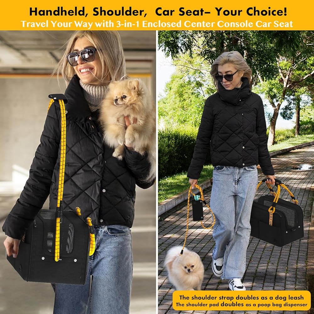 Versatile Carry Options for Easy Travel —Airline-approved size fits under seats. Dual-velcro-straps on the back secure the carrier to rolling luggage handles. Converts to a secure car seat—just thread your car's seatbelt through the rear straps for safe in-car use. Carry by soft handles or go hands-free with a shoulder strap that doubles as a leash. Bonus: the padded stores poop bags—making every trip cleaner and more convenient.