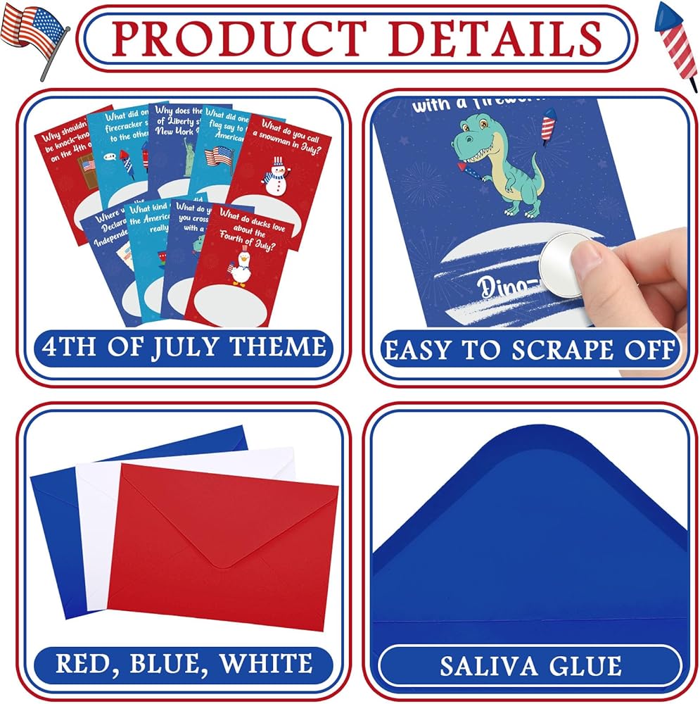 Patriotic theme scratch cards and envelopes are made of thick paper with bright colors, not easy to fade, easy to scratch off, strong and durable, which can give you a good service experience in Independence Day activities