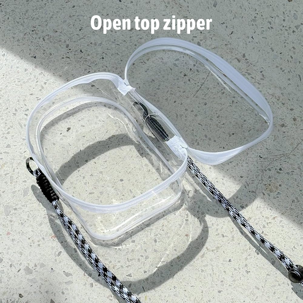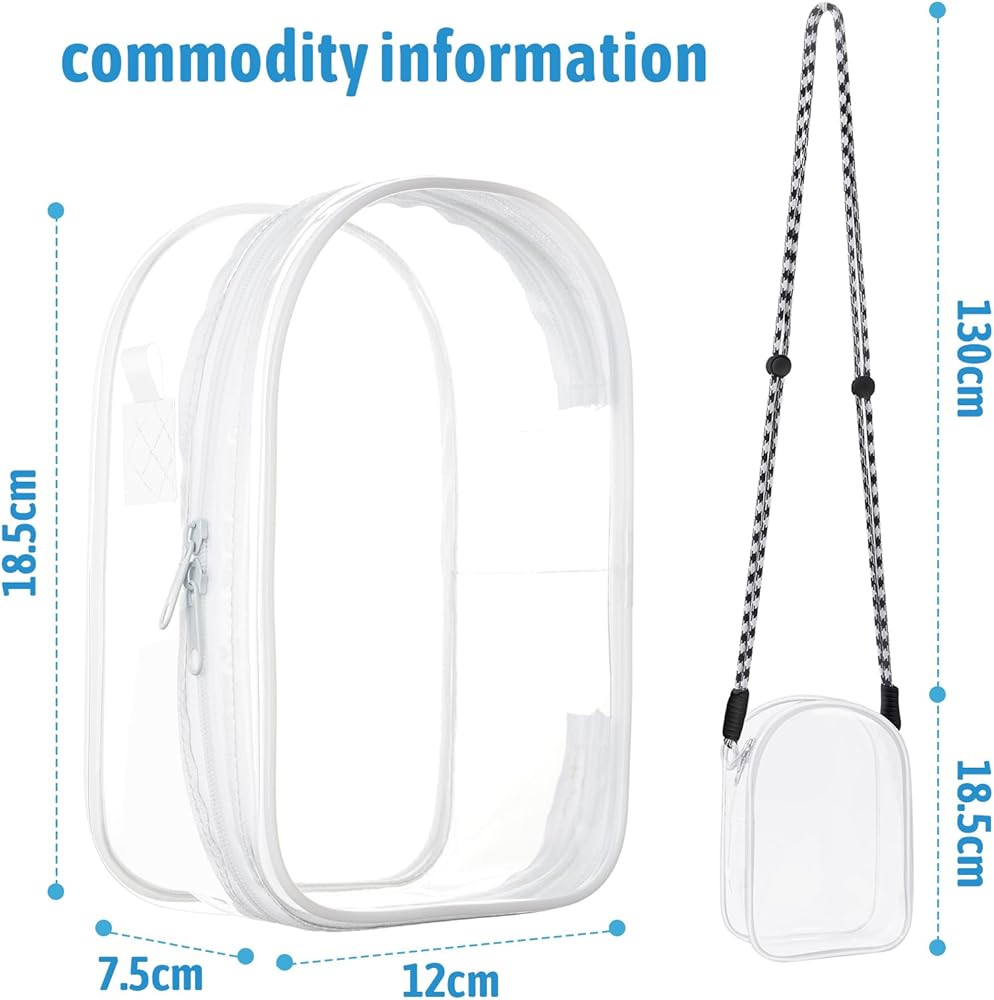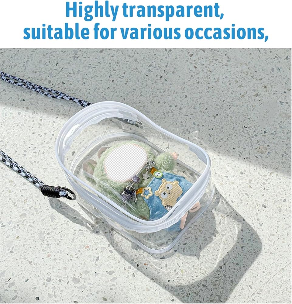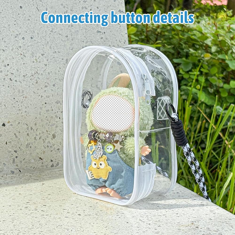 Paired with a 1.3m lanyard strap,Can be used as a backpack, Can be used as a multifunctional storage and display bag, transparent and waterproof appearance, pvc material, can be placed on the desktop vertical, with removable hooks can be hung. Size 7.3*4.7inch, when in use you can use it to store cosmetics, instead of make-up bag, toiletry bag, or children's toys storage bag, plush dolls storage, transparent material can be your dolls or very good display!