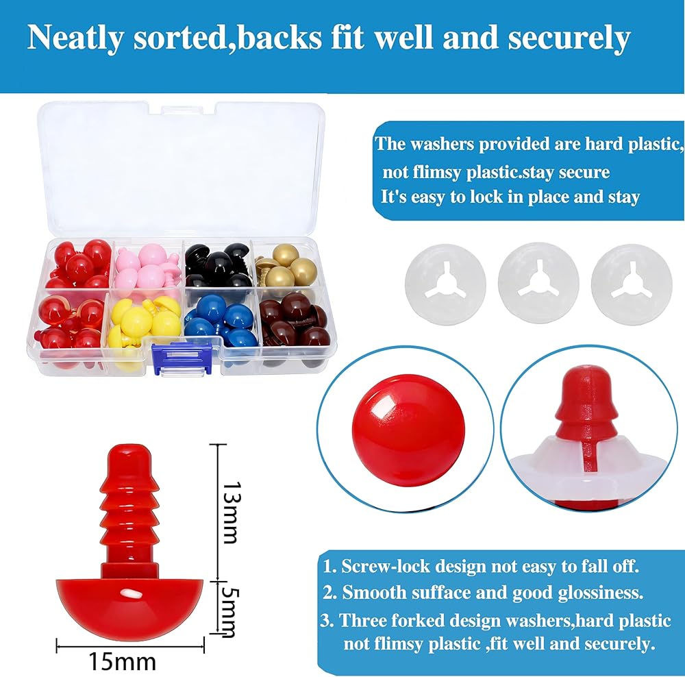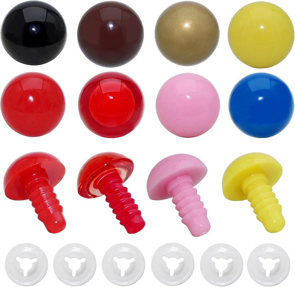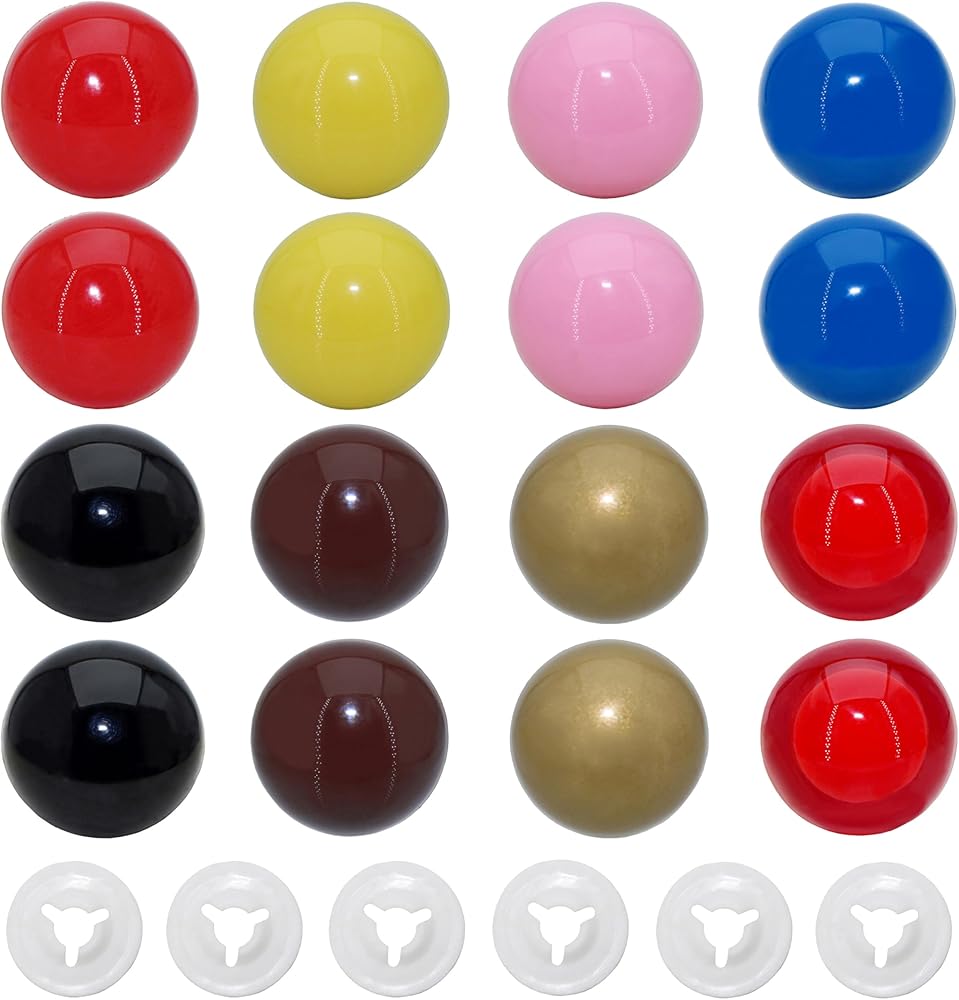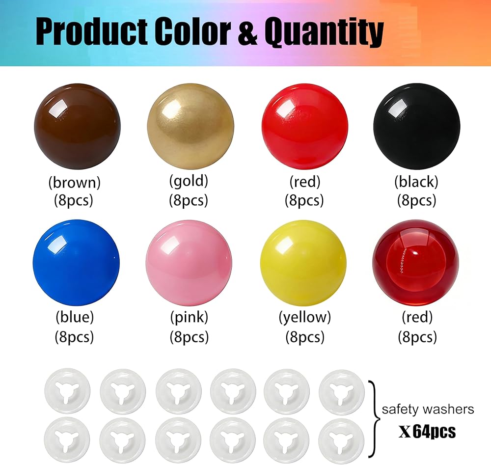 Size and Color : 10mm/0.39inch diameter ; 8different color(red,blue,brown,gold,yellow,pink,black,red pupils safety eyes),each color 14pcs; smooth surface and good glossiness