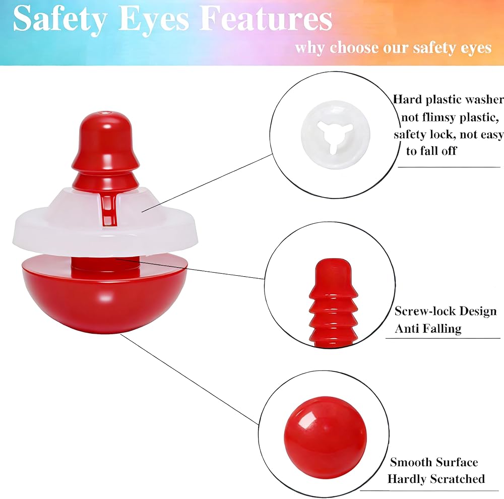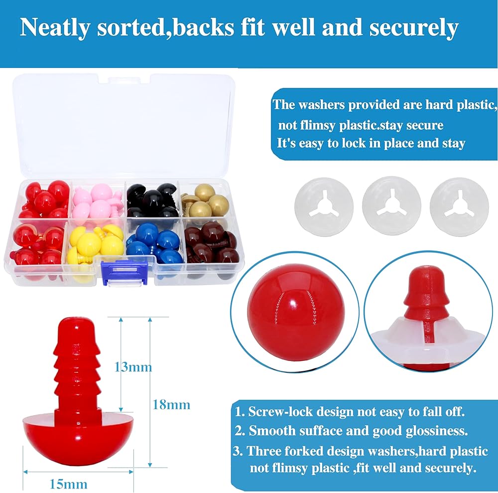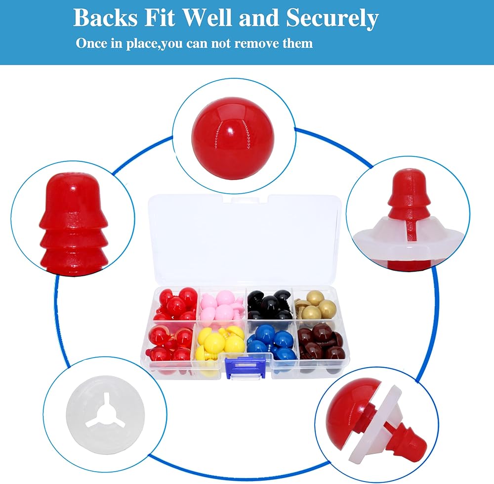 Size and Color : 10mm/0.39inch diameter ; 8different color(red,blue,brown,gold,yellow,pink,black,red pupils safety eyes),each color 14pcs; smooth surface and good glossiness