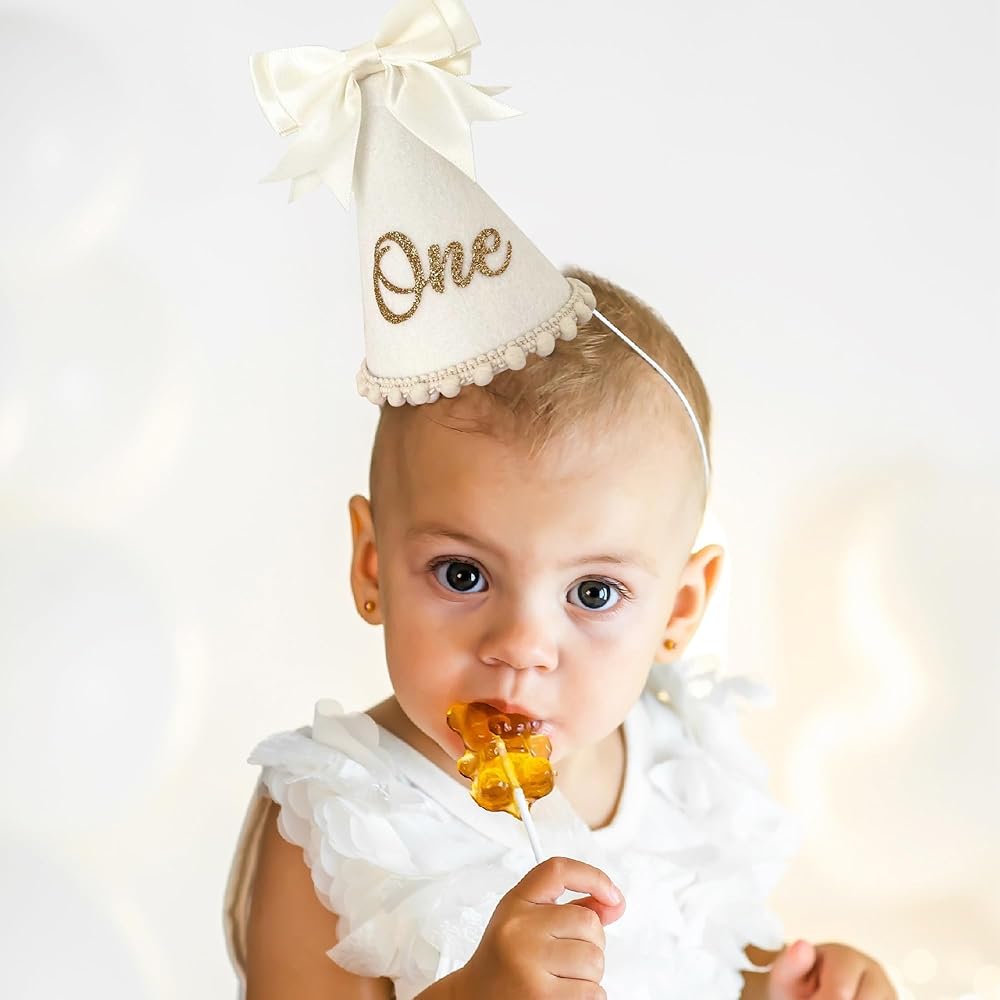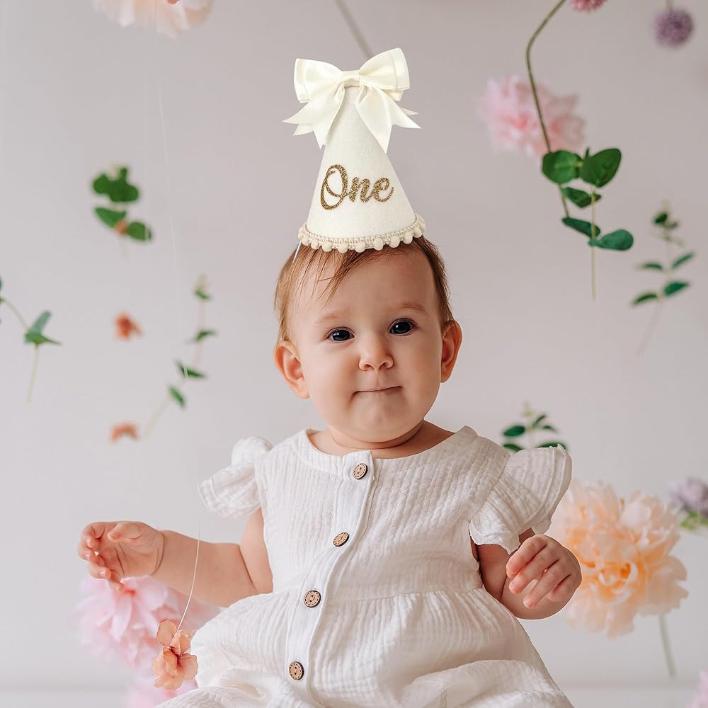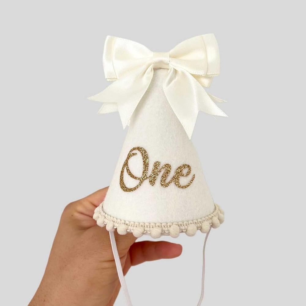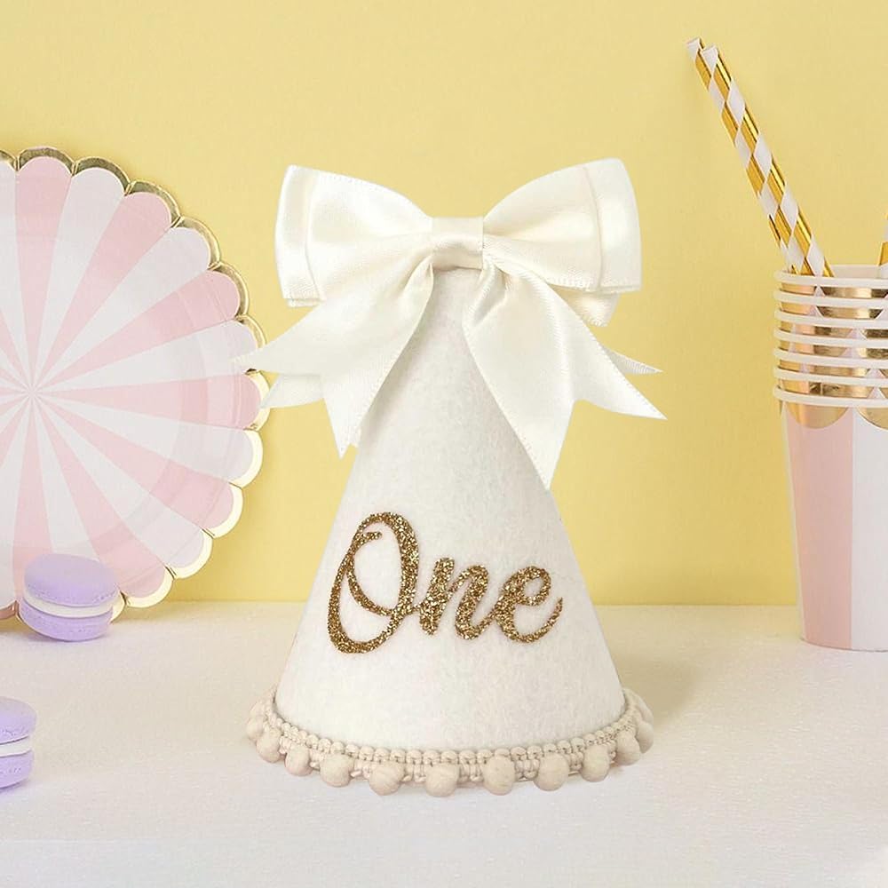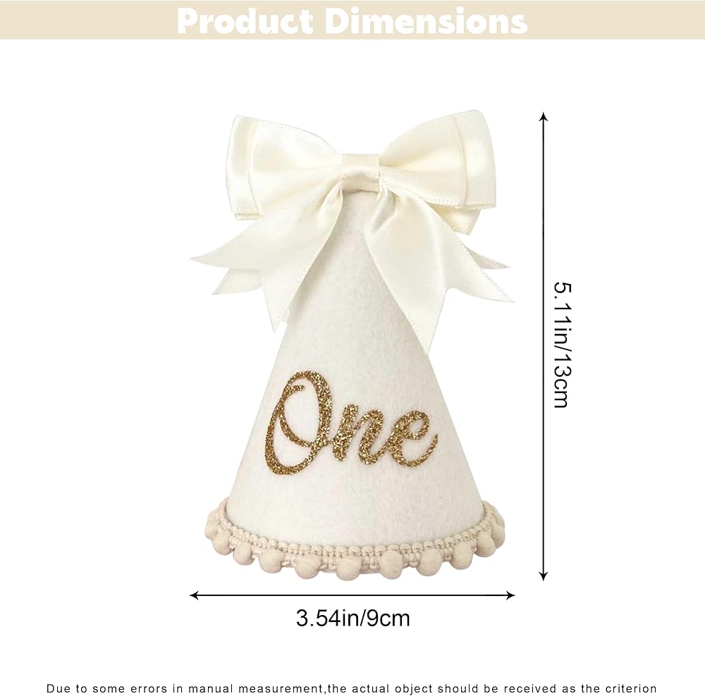 Make your baby girl's first birthday extra special with this adorable white bow 1st birthday hat. Featuring a classic cone design, a soft white color, and a delicate bow on top, this baby girl's 1st birthday crown adds a touch of elegance and charm to any first birthday celebration. Whether it's for a cake smash photoshoot, a birthday party, or a milestone photoshoot, this princess bow cone hat is the perfect finishing touch.