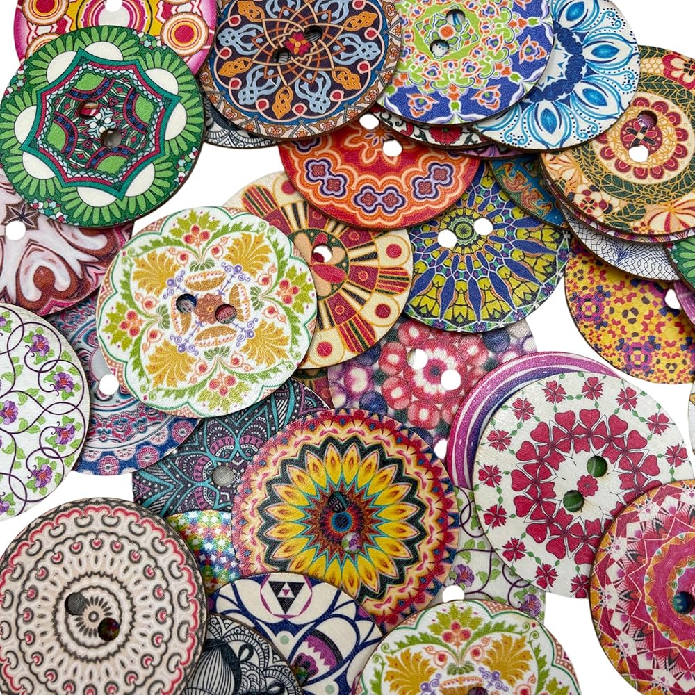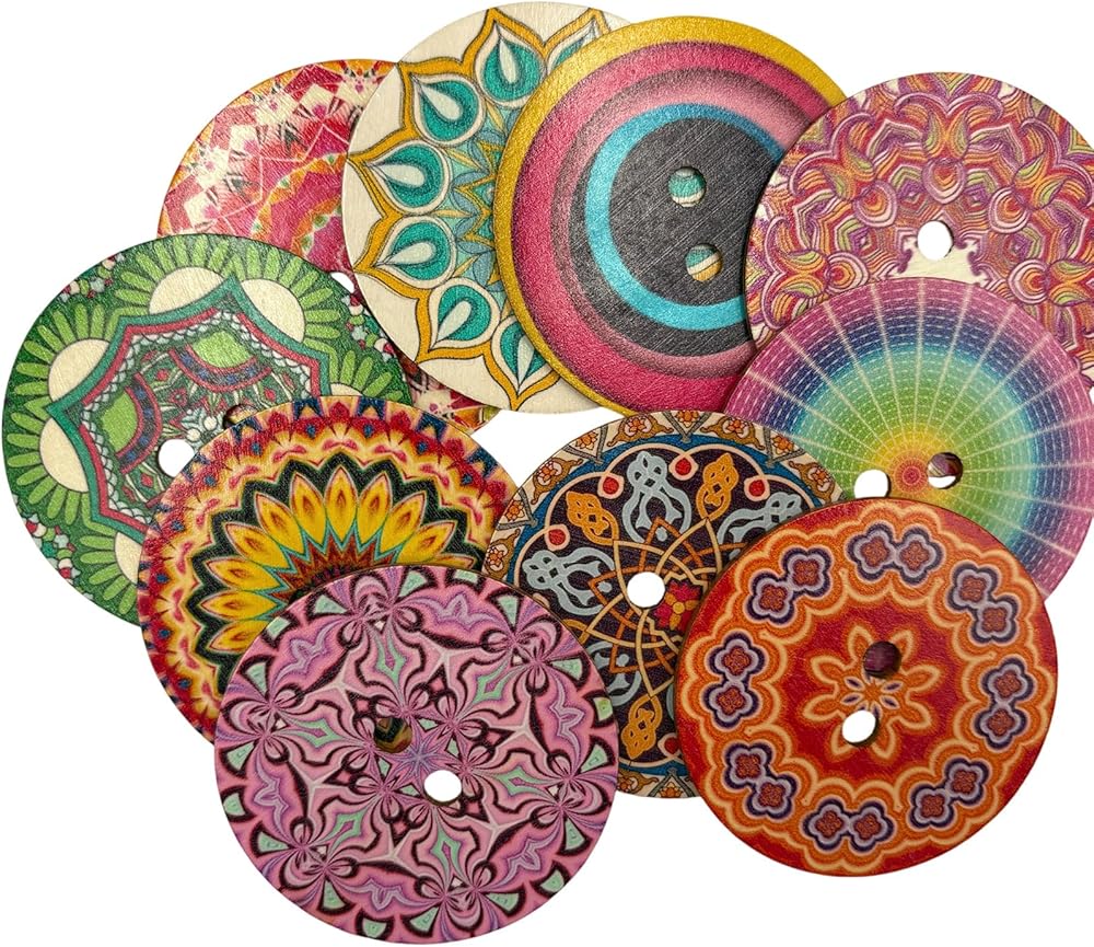 Transform your crafting projects with these stunning oversized wooden buttons featuring intricate mandala patterns. Each pack contains 20 unique buttons measuring 3 inches (75mm) in diameter, perfect for making bold statements in your creative endeavors. The buttons showcase a variety of mesmerizing designs including geometric patterns, floral motifs, and kaleidoscopic arrangements in a beautiful array of colors. These large decorative buttons are ideal for adding character to cushions, bags, wall art, or any fabric craft project that calls for a dramatic accent piece. The wooden construction provides durability while maintaining a natural, artisanal feel. The multicolored collection includes vibrant rainbow patterns, earthy tones, and classic black and white designs, offering versatility for different style preferences. Each button features standard holes for easy attachment, making them suitable for both functional and decorative applications. These statement pieces are perfect for quilters, sewists, and creative enthusiasts looking to add unique, eye-catching elements to their handmade creations.