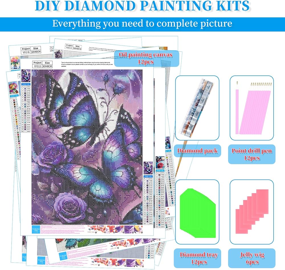 Diamond Art Kits Include: 12 pcs HD canvas (12X16 inch/30x40cm). 12 packs Extra-reflective resin diamonds (matching the canvas color codes).12 Sets Diamond painting tools (12 pcs drill pen,6pcs wax ,12pcs diamonds organizing tray). For each kit we provide 30% diamond more than need. The gem art pictures came flat, not rolled or folded in half, full diamonds