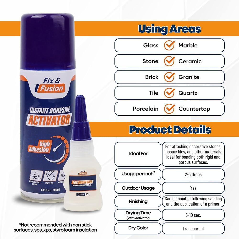 Unlock the full potential of your projects with the FIX & FUSION Super Glue and Activator set. This high-performance adhesive duo delivers rapid, reliable bonding for a wide range of materials including wood, plastic, rubber, granite, and more. Designed to handle both DIY and professional applications, this set provides a quick and powerful solution for all your repair and crafting needs. The FIX & FUSION Super Glue and Activator work in perfect harmony to ensure a robust and long-lasting bond. The activator accelerates the curing process and enhances adhesion strength by preventing the glue from being absorbed by the surface. Simply spray the activator from 20 cm away, wait 5 seconds, then apply the glue and press the surfaces together for a secure bond within 10 seconds at 20°C. Versatility is key with this adhesive set. It excels in gluing wooden profiles, MDF, chip wood, and plastic, and is equally effective for repairing and fixing rubber and wooden parts. Ideal for a range of applications, from kitchen cabinetry and hardware to electrical and plumbing tasks, this adhesive set is also perfect for various craft projects. Experience a clean and efficient application with the aerosol activator that delivers a fine mist, and a viscous glue that remains in place, ensuring no mess or residue. Only small amounts of each component are required for an effective and tidy application. Whether you're a DIY enthusiast or a professional, the FIX & FUSION Super Glue and Activator set is your go-to solution for quick, powerful, and versatile bonding.