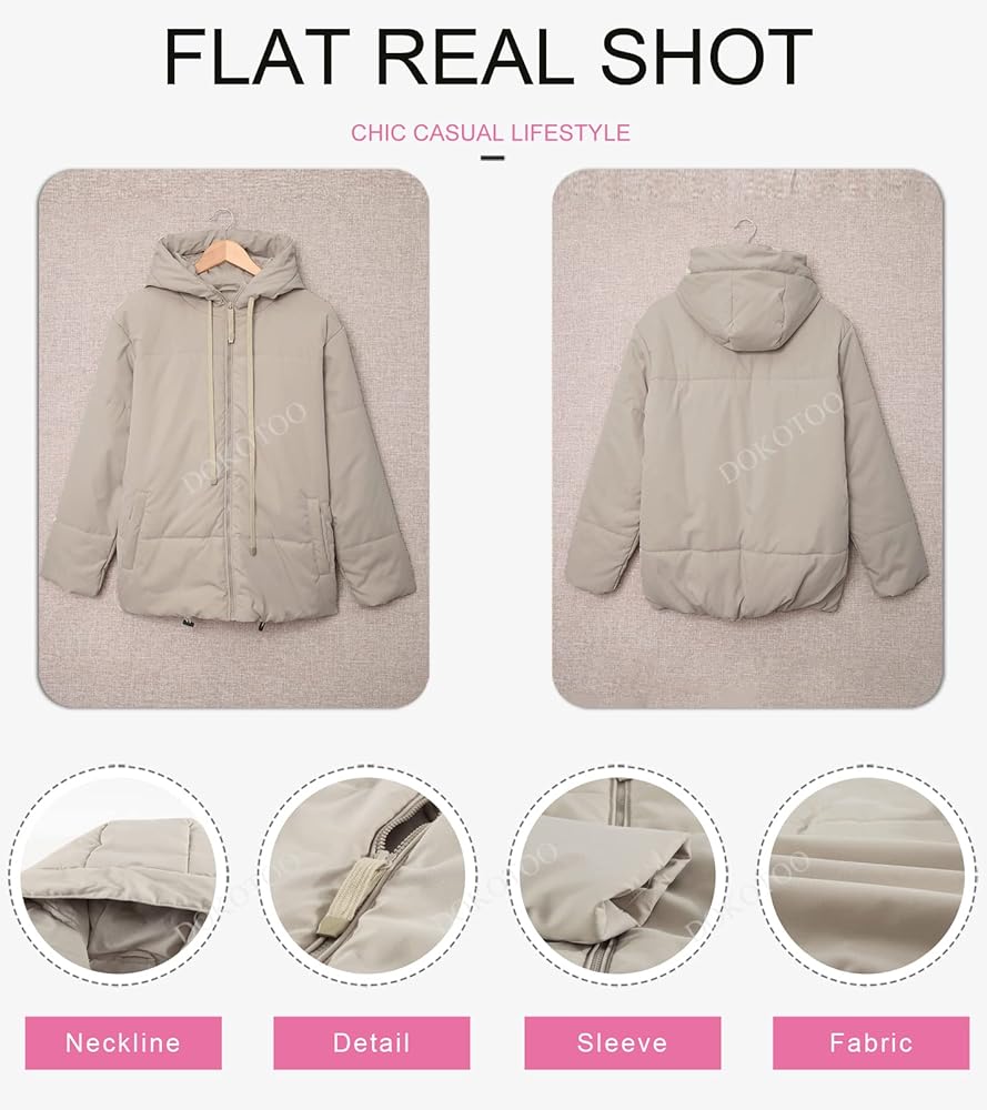 Women short puffer jacket features drawstring in the hood,full zipper,basic solid color,oversized style,two side pockets,easy to pair with jeans or other leggings.