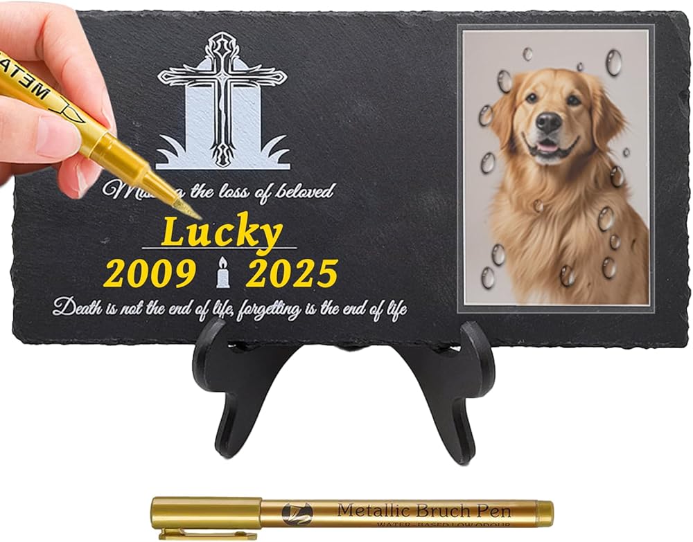 【Personalized Pet Memorial Stones for Dogs】This is a beautifully designed pet memorial stone, which have a variety of patterns to choose from, and you could fill in pet's name and date with a matching pen. You can also put a photo of your pet in the frame to make the pet memorial stone a unique souvenir gift.