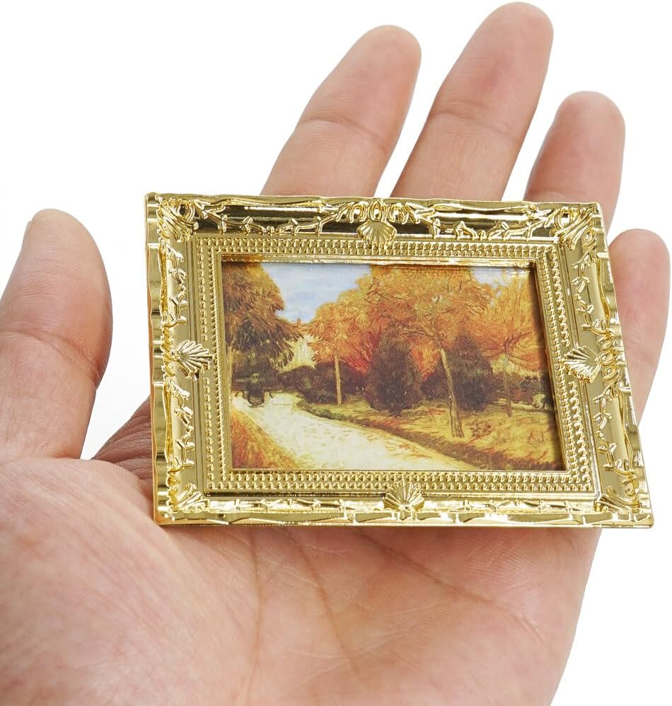 High Quality: The dollhouse artwork painting is made of high-quality plastic material for long-term use. A beautifully vintage miniature picture frame, featuring a detailed gold ornate design, showcases a miniature replica of a famous Van Gogh painting.