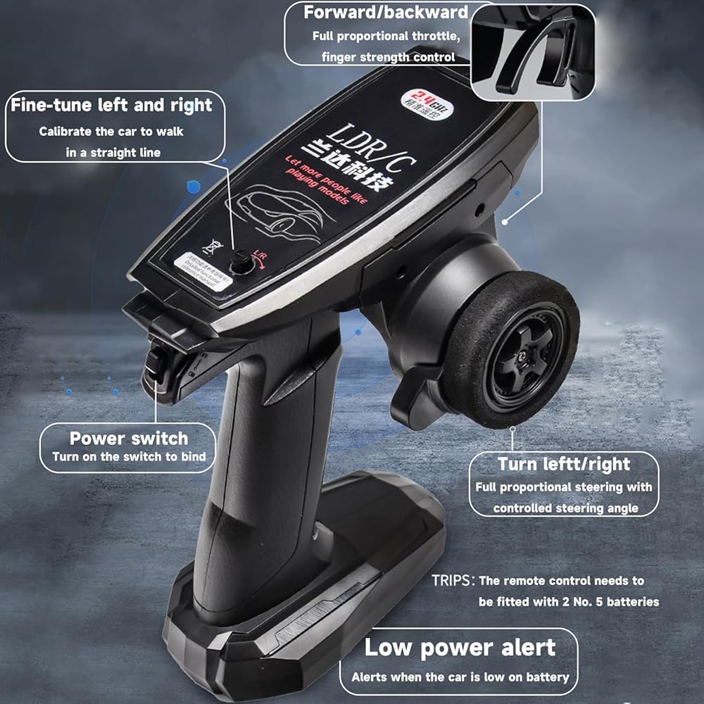 【4WD System for Enhanced Stability】The 4WD system, combined with a high-torque brushed motor, ensures enhanced traction and balanced power distribution. This makes the LD2801 stable and easy to handle during high-speed drifts or tight turns, perfect for creating your own drift track at home.