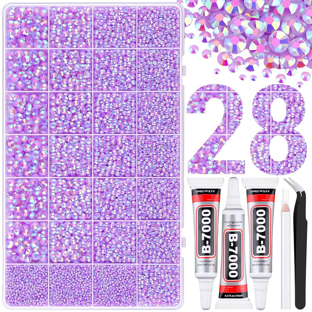PACKAGE CONTENT -- Include 1 box with 24 grids, featuring a variety of colors, approx. 24000 pcs of 3mm bling-out resin rhinestones. 1 tweezers and 1 pickup pen are included for easily picking up gems. 3 B7000 adhesive jewels glue for jewelry making