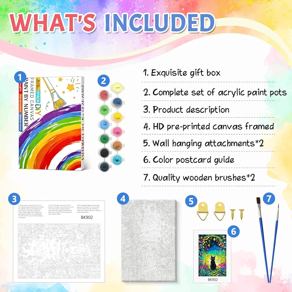 【What's in our package】Our paint by numbers included:A 8x12 inch wrinkle free pre-printed digital canvas (installed on a wooden frame), a gift box, a set of acrylic paint(with an additional 30% pigment added), 3 different sizes of brushes, 2 hooks and required screws, and a numbered canvas paper sketch for reference