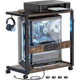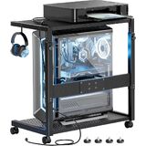 2 Tier Computer Tower Stand with Charging Station, Floor PC Stand Fits Under Desk, Rolling C Shaped End Table with USB Port, CPU Holder Cart for Carpet with Hooks, Home Office