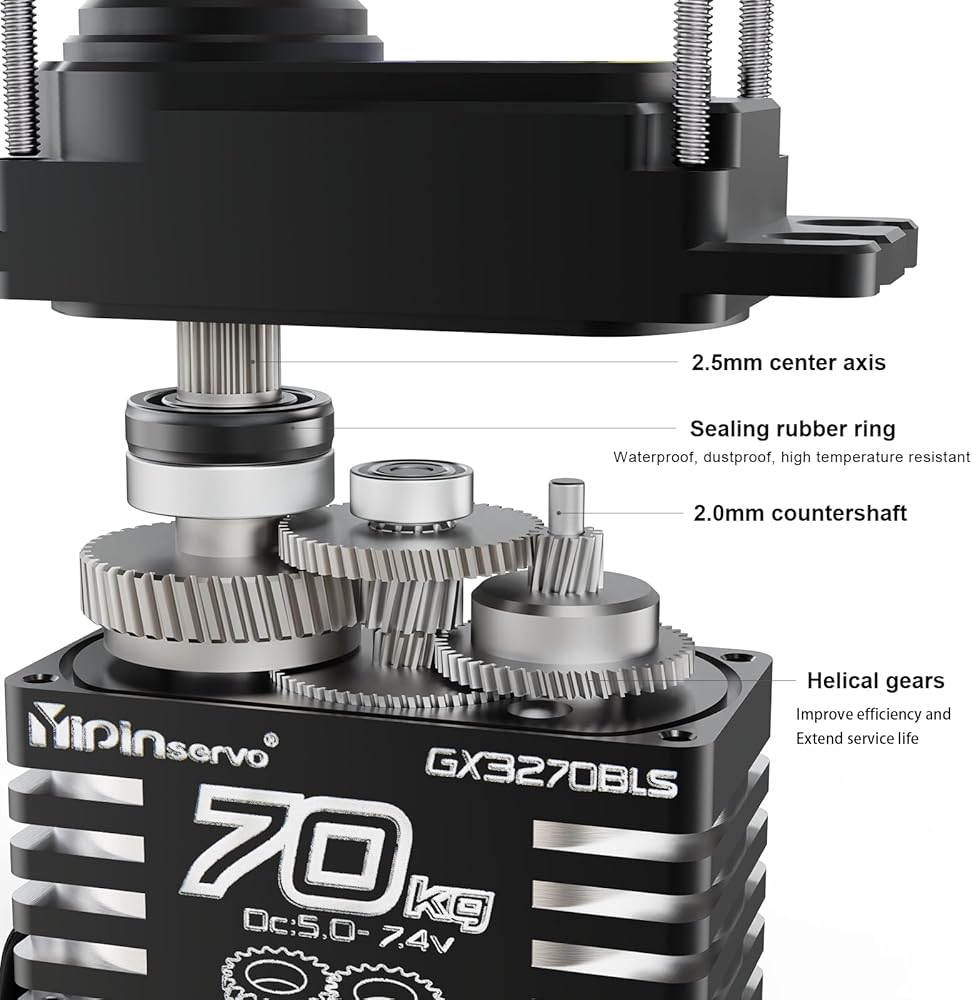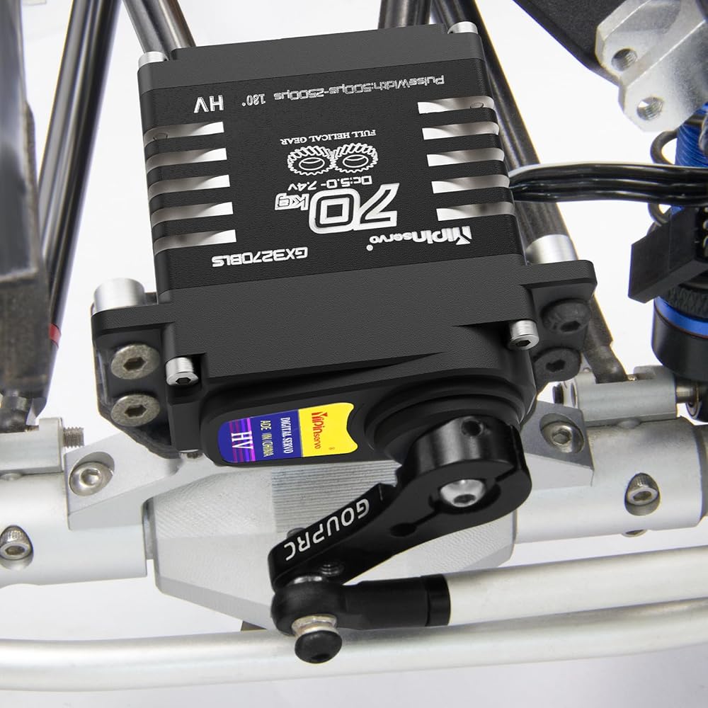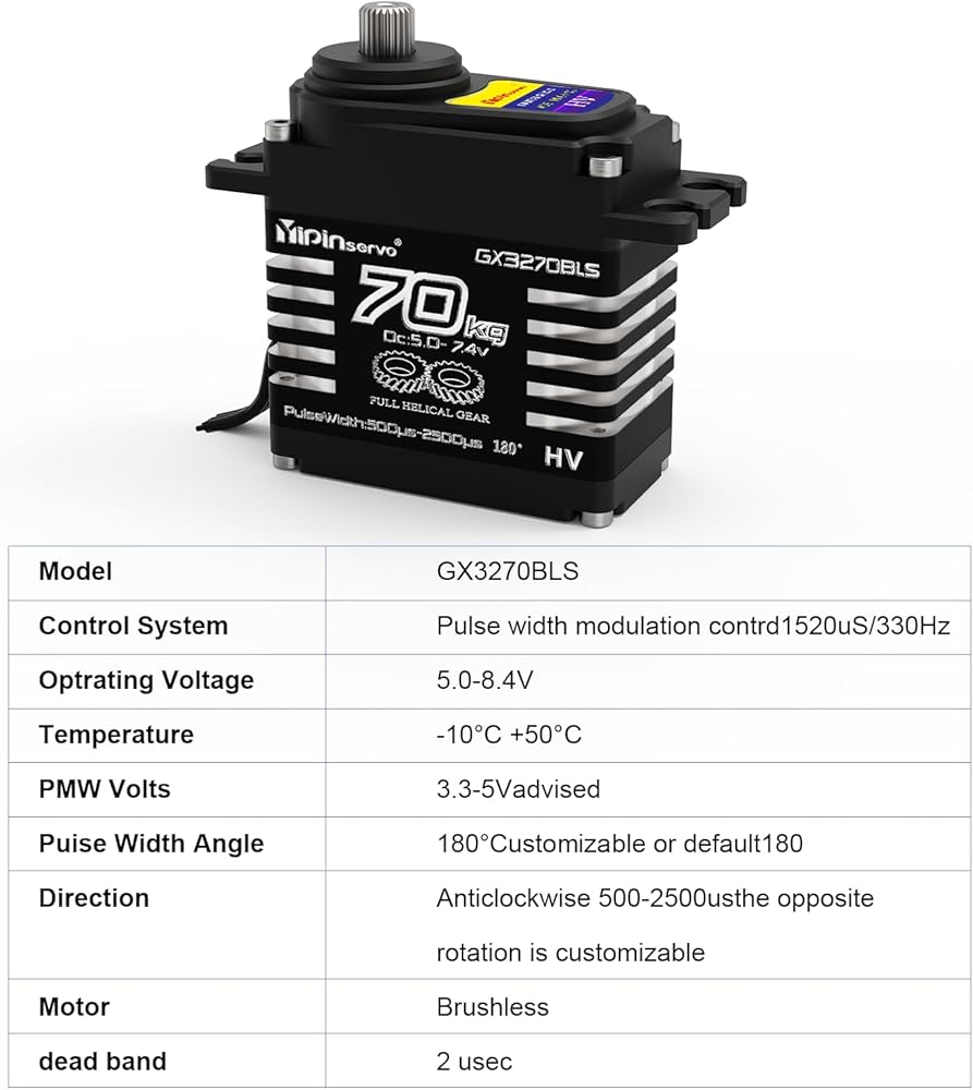 High Pressure Servo:8.4V and the Speed can Reach 0.08sec/60°, Control Angle 180°. The Maximum Torque of This RC Steering Servo can Reach 70kg.